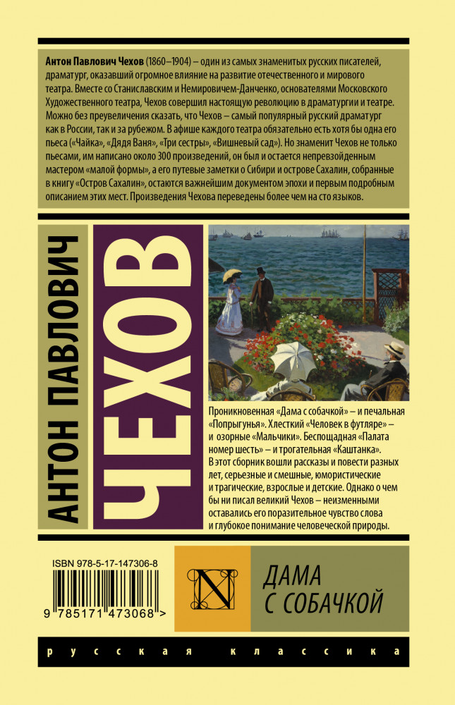 Дама с собачкой. РассказыВ данный момент этот товар отсутствует в продаже. Возможно, у нас найдется аналогичный или похожий товар здесь. Серия: Эксклюзивная классика (Лучшее) Проникновенная «Дама с собачкой» — и печальная «Попрыгунья». Хлесткий «Человек в футляре» — и озорные «Мальчики». Беспощадная «Палата номер шесть» — и трогательная «Каштанка». |