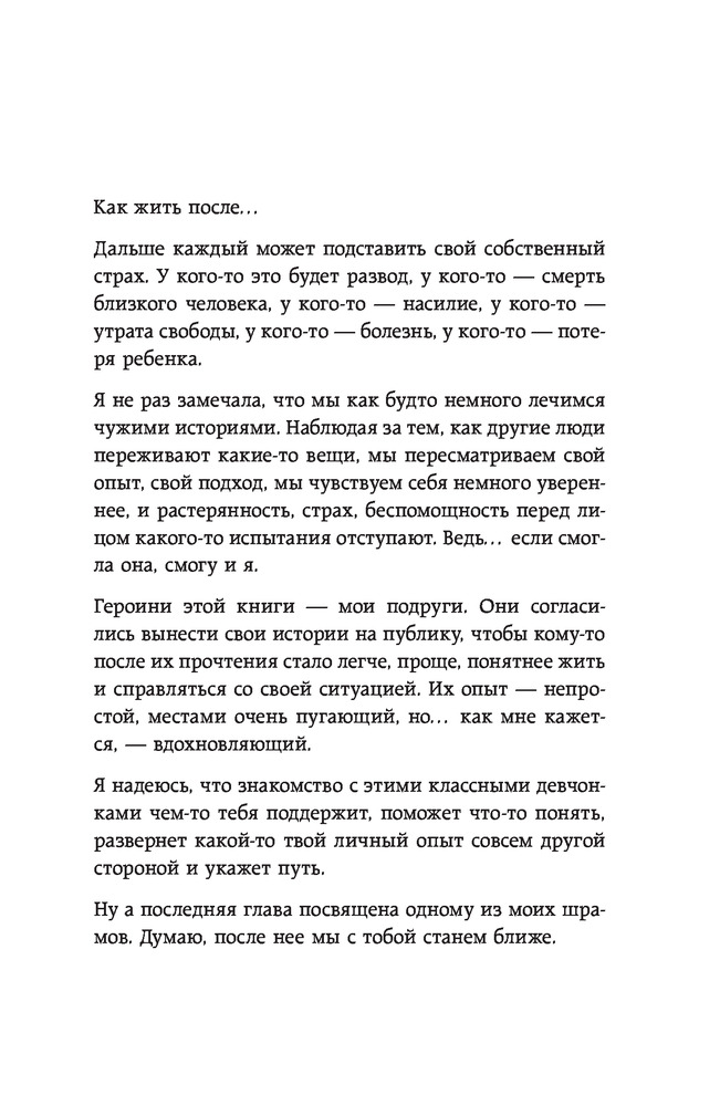 Офигенная книга! Прочитала за два часа! Очень глубокие истории героинь тронули за душу. А поддерживающие тексты Ники,взяла в свою повседневную жизнь. Спасибо большое! Очень рекомендую