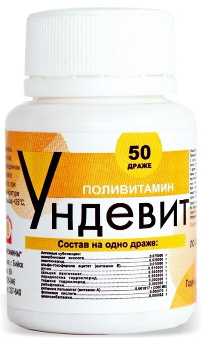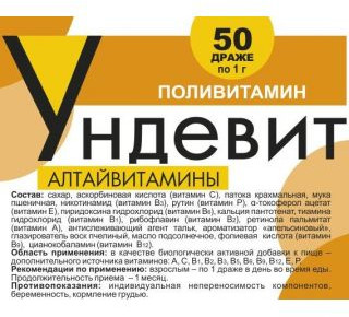 АлтайВитамины Драже «Ундевит»В данный момент этот товар отсутствует в продаже. Возможно, у нас найдется аналогичный или похожий товар здесь. Применяют для профилактики и лечения гиповитаминоза, развивающегося на фоне перечисленных состояний: при применении антибиотиков, в период выздоровления после перенесенных заболеваний, при повышенных физических и умственных нагрузках; для улучшения обмена веществ в пожилом и старческом возрасте. |