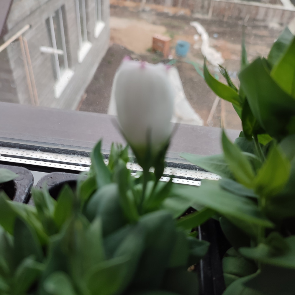 Красивая и самая быстрая из всех гибридов. единственная успела к 8 марта 2025г. при посадке 6.10.2024г. На последней уже после пересадки в больший ящик и там Рози бело-розовая и Сапфир Блу чип. Видно по кончикам лепестков, они характерные.