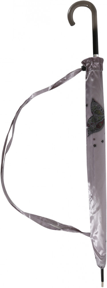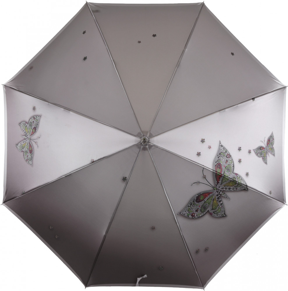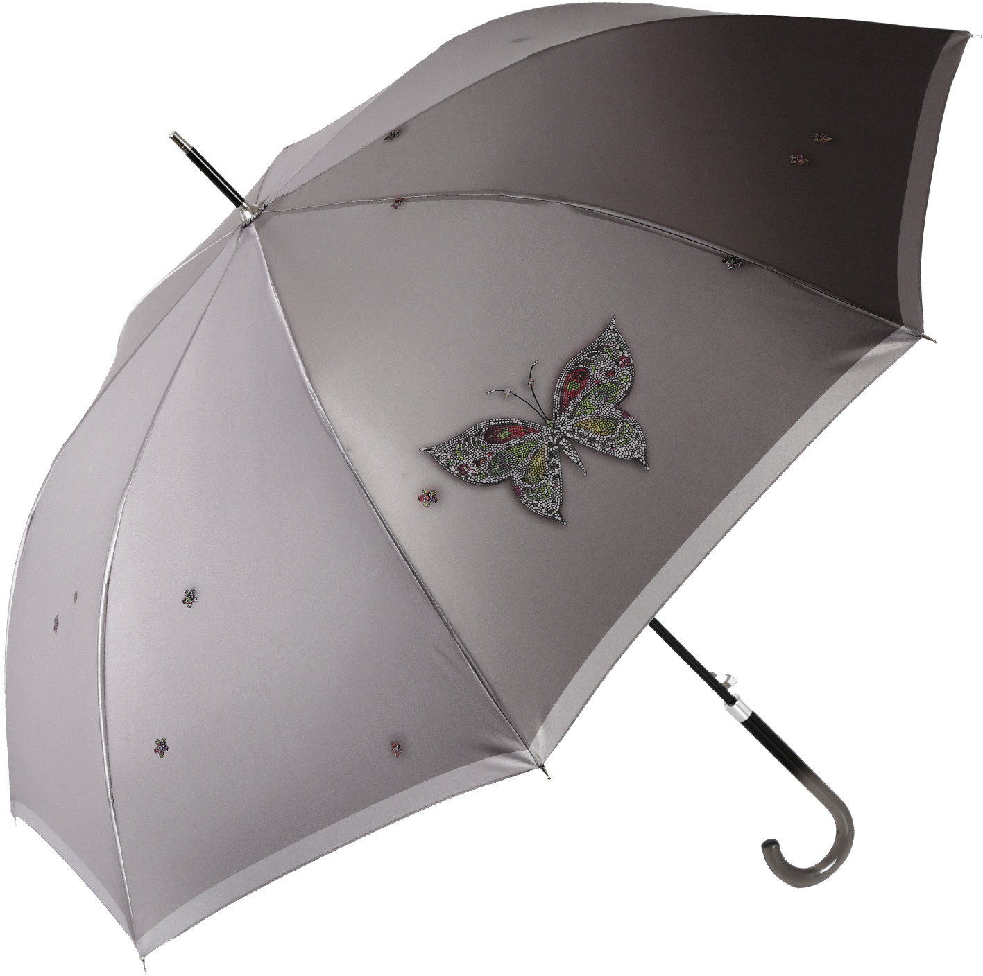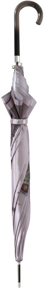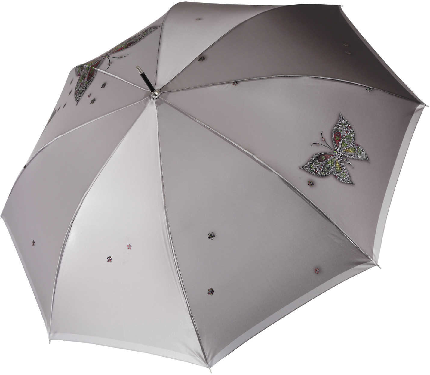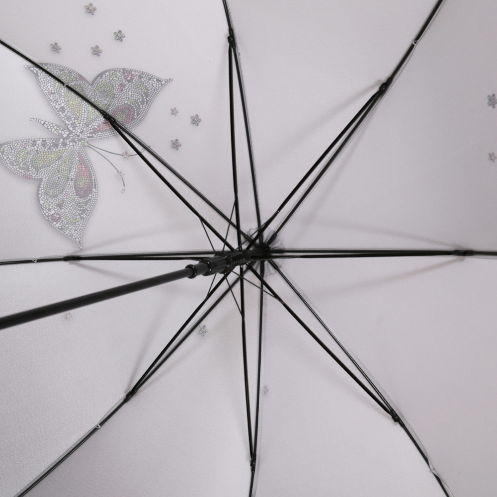 Купол стильного зонта-трости «Fabretti» выполнен из полиэстера с приятной гладкой фактурой и сатиновым блеском. Вода, попадая на такой купол, превращается в капли и легко скатываться вниз. Украшением служит изображение бабочек, декорированных в мозаичном стиле.