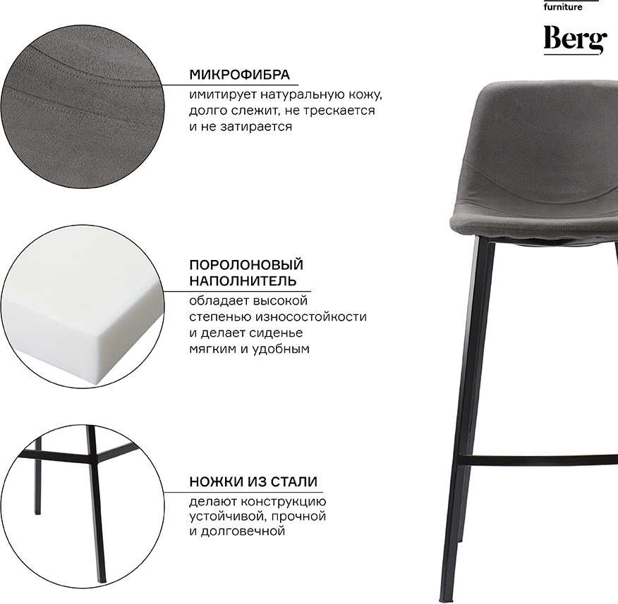 Сиденье стула плавно переходит в спинку с оптимальным углом наклона, что обеспечивает комфортное размещение на протяжении длительного времени без чувства усталости. Дополнительное удобство при сидении достигается за счет наличия специальной подставки для ног. Материал обивки имеет привлекательный вид, обладает хорошими эксплуатационными характеристиками, такими как прочность, простой уход и долгий срок службы. Ножки из стали делают конструкцию устойчивой.