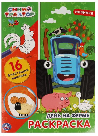 Раскраска с блестящими наклейками «Синий трактор. День на ферме» станет прекрасным подарком для поклонников известного мультсериала про приключения весёлого трактора: |