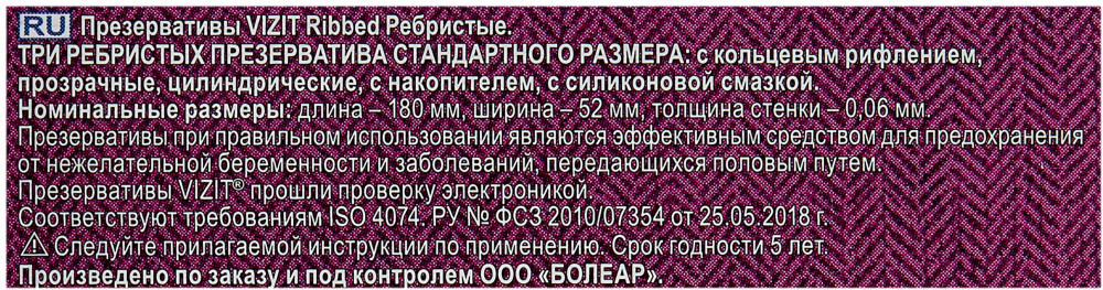 Презервативы с кольцевым рифлением, с накопителем, с силиконовой смазкой. Презервативы Ribbed помогут привнести новое измерение в ваши отношения. Их ребристое кольцевое рифление способно не просто усилить ее наслаждение, но и создать совершенно новые чувства и эмоции для каждого из партнеров. Больше смелых, но безопасных экспериментов с Vizit Ribbed!