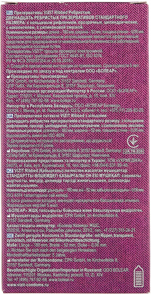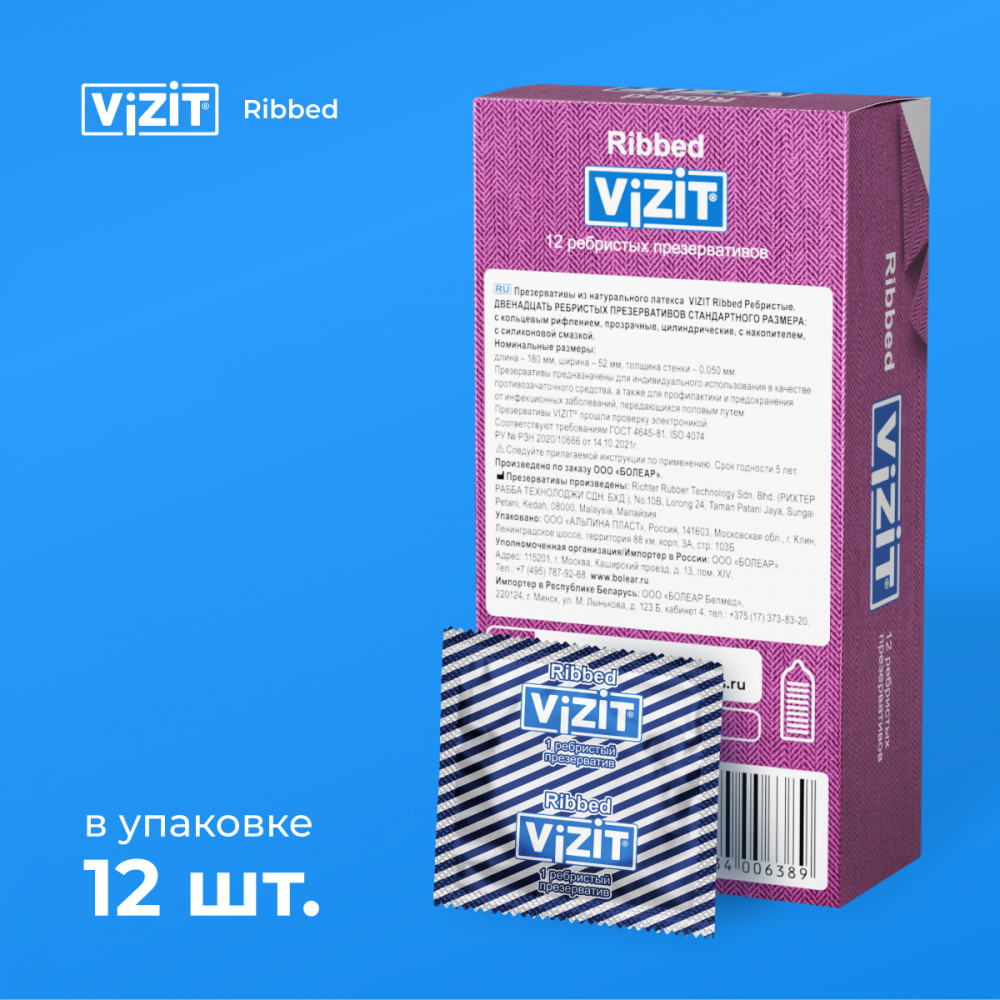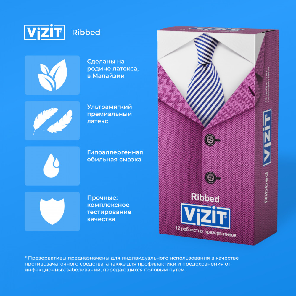 Презервативы ребристые это интимные товары для взрослых из тончайшего натурального латекса с обильной смазкой. Каждый презерватив обеспечивает максимальную чувствительность, высокий уровень комфорта и безопасности во время секса. Эти товары 18+ идеальный выбор для тех, кто хочет сохранить естественность ощущений и удобство во время интимной близости. Наши ультратонкие презервативы не спадают и не передавливают, легко надеваются и сохраняют всю полноту ощущений при половом акте. Ребристые с кольцевым рифлением презервативы VIZIT Ribbed изготавливаются только из премиального латекса, они отлично растягиваются, не рвутся и надежно защищают от нежелательной беременности и инфекционных заболеваний, передающихся половым путем. Инновационные технологии производства позволяют создавать контрацептивы из ультратонкого и мягкого латекса, обладающего при этом высоким уровнем прочности и надежности. Товары 18 +, представленные в нашем магазине, подходят для всех видов секса, а также совместимы с секс-игрушками и другими интимными товарами, представленными в секс шопах. Наши презервативы и лубриканты являются оригинальным брендом, напрямую поставляемым от производителя. Они имеют все необходимые регистрационные удостоверения и сертификаты, соответствуют самым высоким стандартам качества и безопасности и проходят тщательную и многоуровневую проверку для обеспечения лучших свойств.