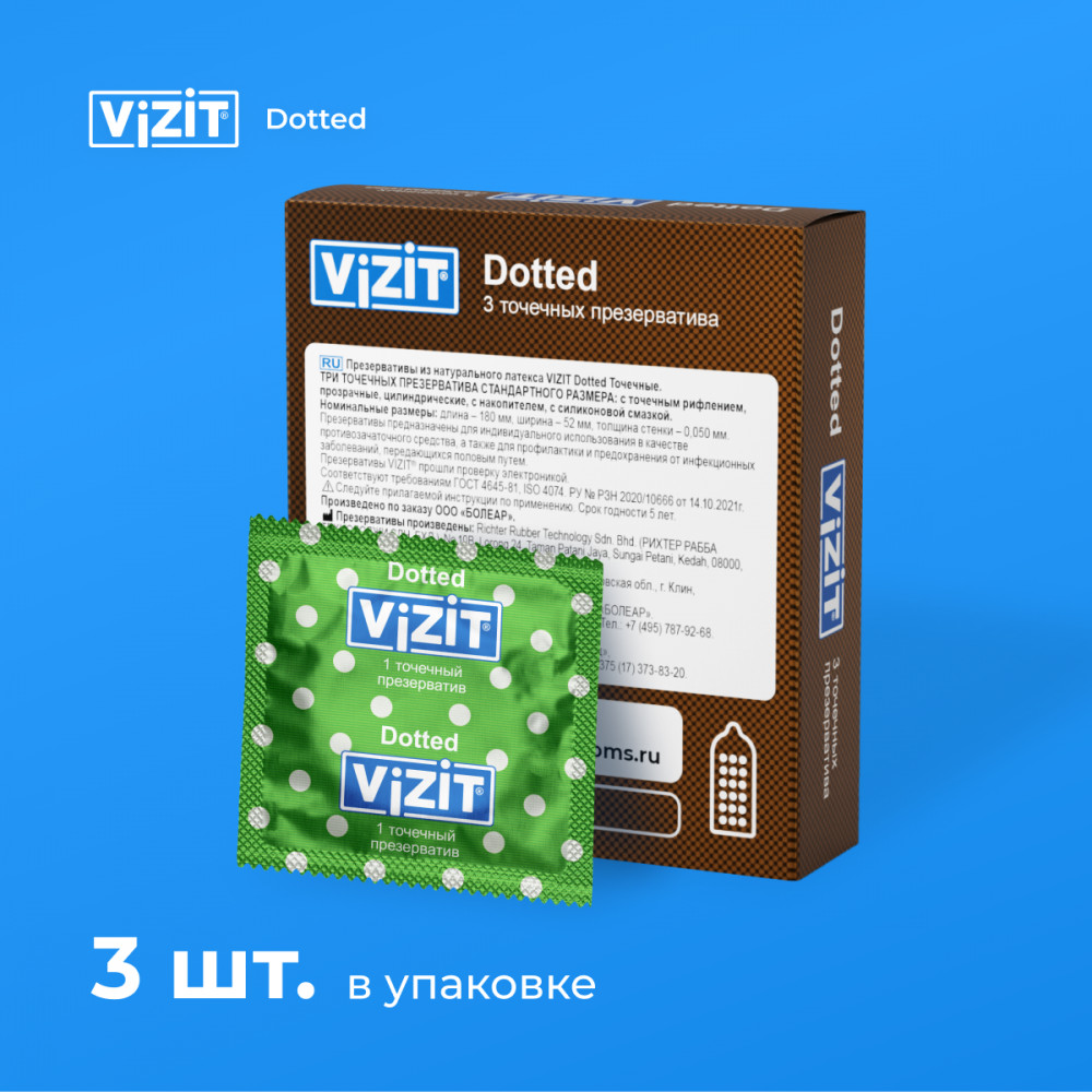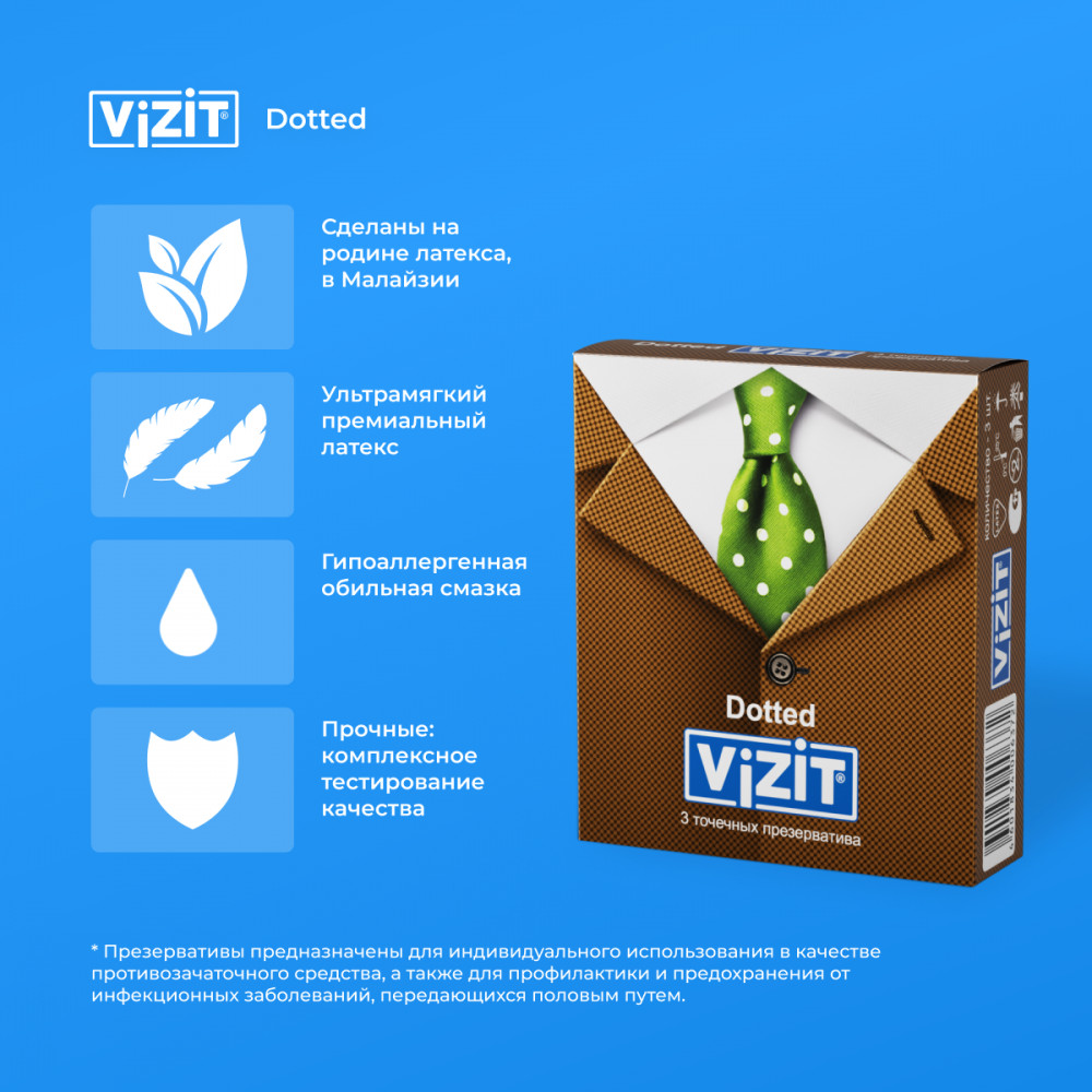 Презервативы с точечным рифлением, с накопителем, с силиконовой смазкой. Презервативы Vizit Dotted отлично подойдут для джентльмена, который хочет приятно удивить свою избранницу и доставить ей максимум удовольствия. Их игривое точечное рифление производит неизгладимое впечатление и помогает вашей партнёрше достичь пика наслаждения. Отдайтесь вихрю ярких, но безопасных эмоций с Vizit Dotted!