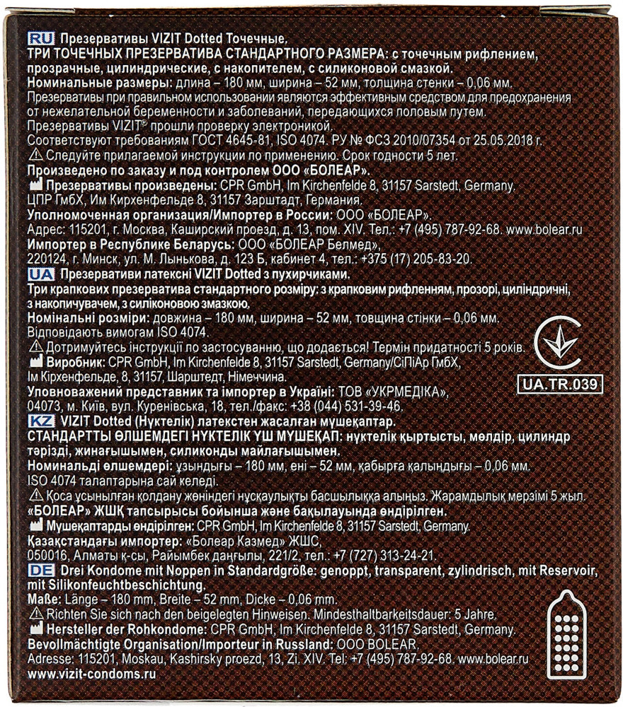 Презервативы с пупырышками это интимные товары для взрослых из тончайшего натурального латекса с обильной смазкой. Каждый презерватив обеспечивает максимальную чувствительность, высокий уровень комфорта и безопасности во время секса. Эти товары 18+ идеальный выбор для тех, кто хочет сохранить естественность ощущений и удобство во время интимной близости. Наши ультратонкие презервативы не спадают и не передавливают, легко надеваются и сохраняют всю полноту ощущений при половом акте. Точечные презервативы VIZIT Dotted изготавливаются только из премиального латекса, они отлично растягиваются, не рвутся и надежно защищают от нежелательной беременности и инфекционных заболеваний, передающихся половым путем. Инновационные технологии производства позволяют создавать контрацептивы из ультратонкого и мягкого латекса, обладающего при этом высоким уровнем прочности и надежности. Товары 18 +, представленные в нашем магазине, подходят для всех видов секса, а также совместимы с секс-игрушками и другими интимными товарами, представленными в секс шопах. Наши презервативы и лубриканты являются оригинальным брендом, напрямую поставляемым от производителя. Они имеют все необходимые регистрационные удостоверения и сертификаты, соответствуют самым высоким стандартам качества и безопасности и проходят тщательную и многоуровневую проверку для обеспечения лучших свойств. Прочность презервативов проверяется в ходе многократных испытаний на современном оборудовании.