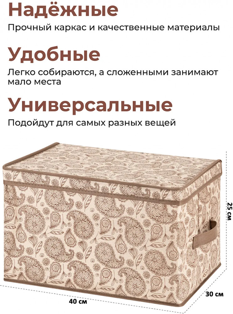El Casa Короб для хранения складнойВ данный момент этот товар отсутствует в продаже. Возможно, у нас найдется аналогичный или похожий товар здесь. Серия: Пейсли Короб складной поможет организовать хранение в самых разных помещениях: в прихожей, гостиной, спальне, детской и любых других комнатах. Такие кофры эстетично выглядят. Их можно разместить не только в шкафу, но и на открытых полках. Помогут организовать систему хранения самых разных вещей в едином стиле, будь то игрушки, одежда, канцелярия, косметика, нижнее белье, носки, рукоделие или другие мелочи. Органайзер выполнен из нетканого материала и имеет плотные картонные вставки. Имеет ручку, чтобы коробку было удобно выдвигать как ящик. Такой контейнер станет удобным дополнением дома и поможет эффективно использовать каждый сантиметр пространства. |