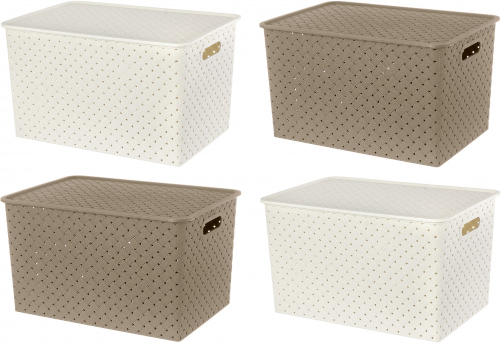 Корзинка объемом 14 л с крышкой выполнена из качественного прочного пластика с двумя ручками-выемками. Крышка плотно закрывается, а специальное плетение с дырочками позволяет воздуху проникать внутрь и не дает продуктам испортиться от недостатка кислорода. В корзинке можно хранить как овощи и фрукты, так и хозяйственные предметы. Крышки корзинки сконструированы таким образом, что корзинки разных размеров можно удобно и надежно разместить друг на друге, составив удобный и функциональный набор. Корзинки представлены разных объемов, форм и расцветок, что позволит собрать уникальный набор, подходящий под ваши потребности.