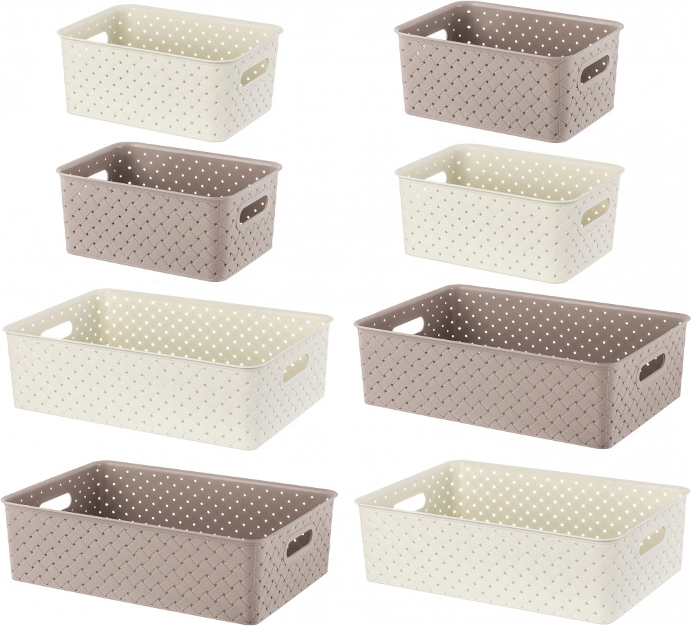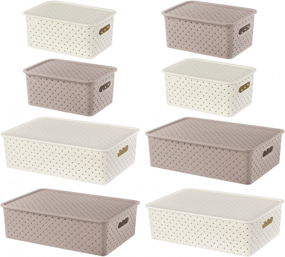 корзины изготовлены из прочного пластика,красивый дизайн.Крышки плотно закрываются,что не мало важно.