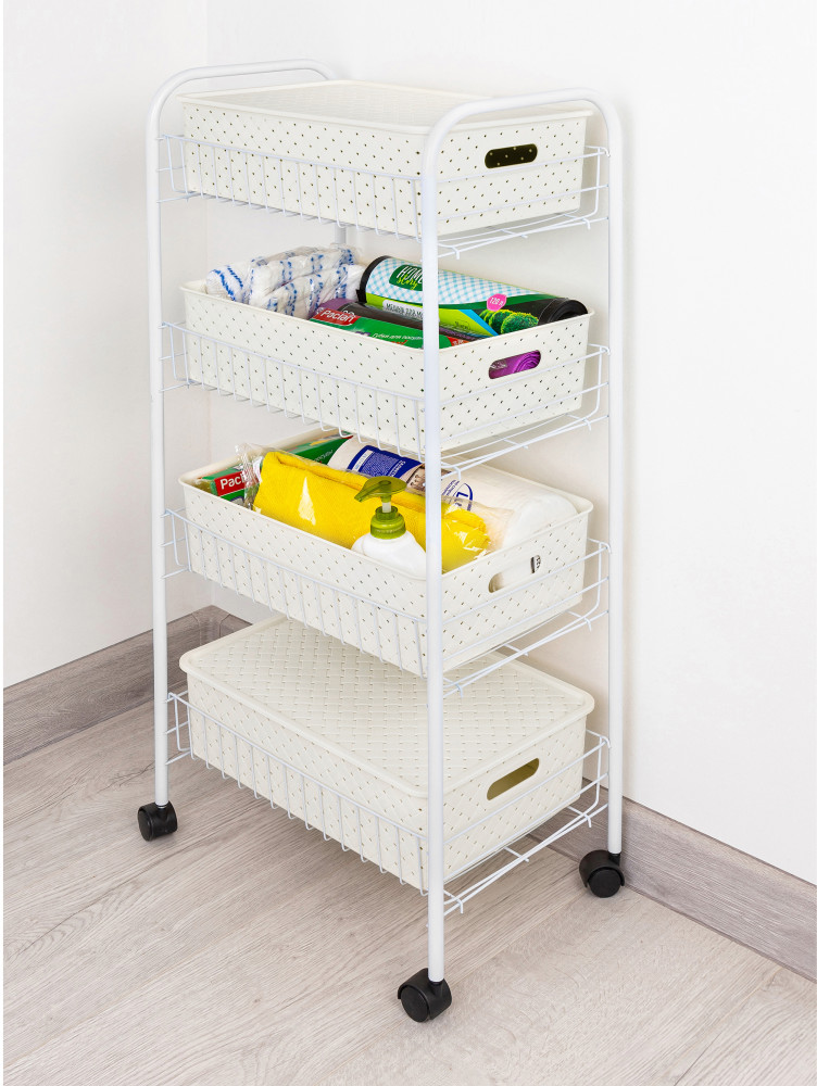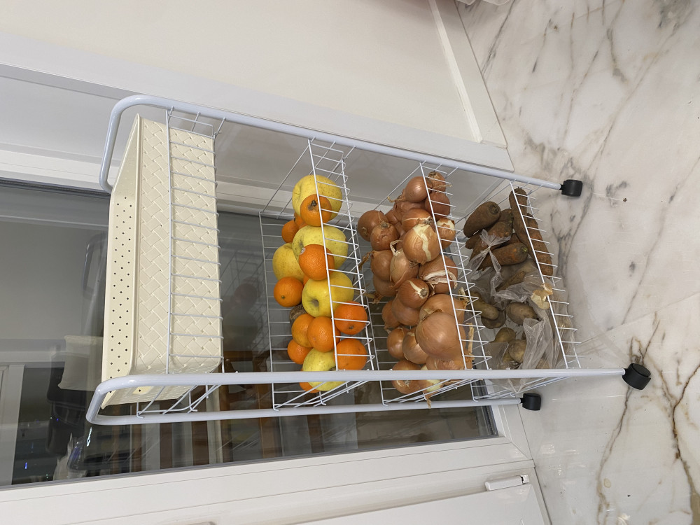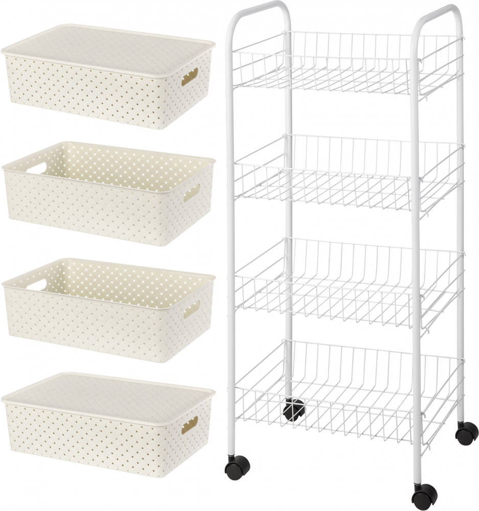 Удобный размер, легко собирается, можно корзины пластиковые использовать отдельно (на фото только одна корзинка, так их в комплекте 4 и крышки 2)