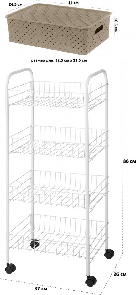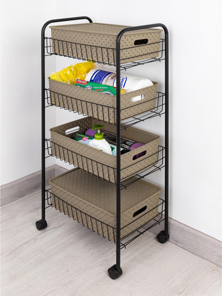 Удобный размер, легко собирается, можно корзины пластиковые использовать отдельно (на фото только одна корзинка, так их в комплекте 4 и крышки 2)