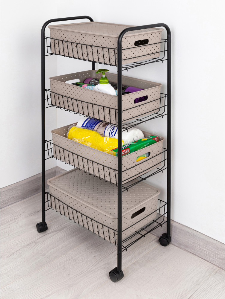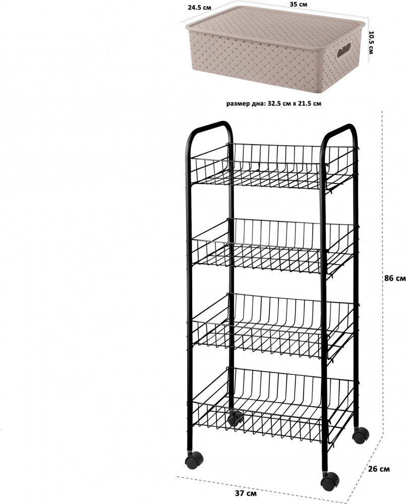Удобный размер, легко собирается, можно корзины пластиковые использовать отдельно (на фото только одна корзинка, так их в комплекте 4 и крышки 2)