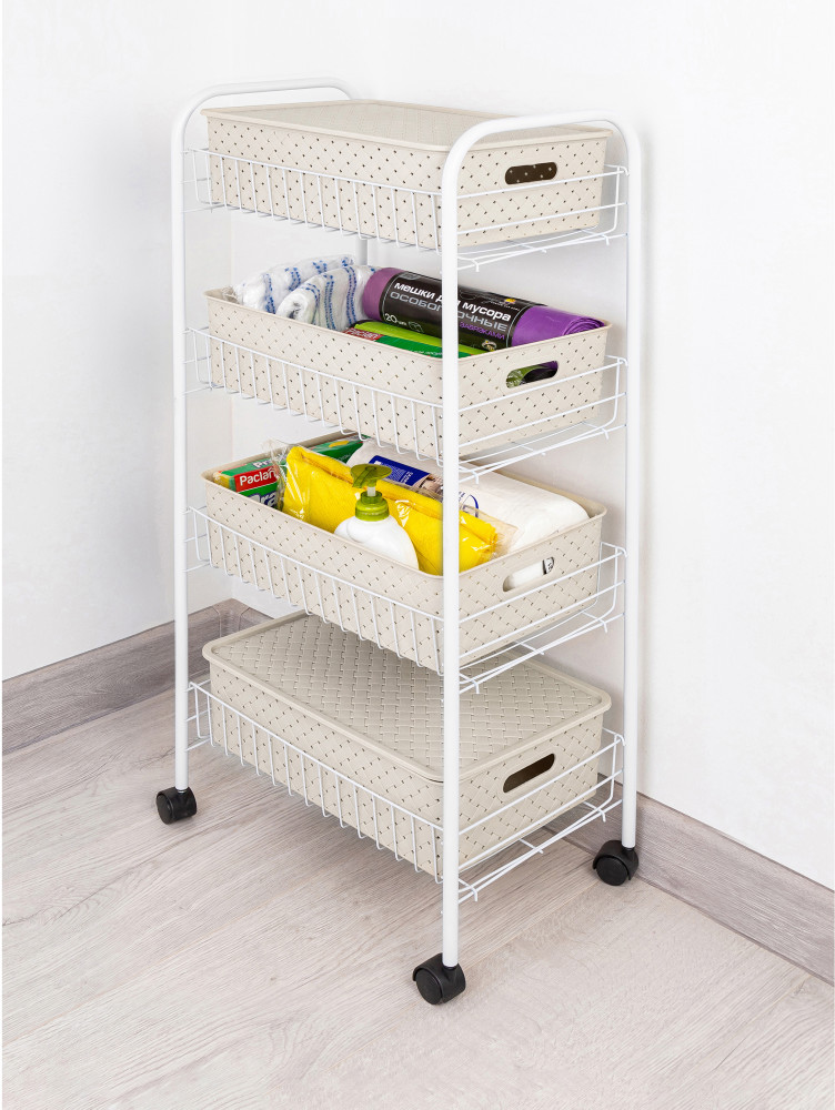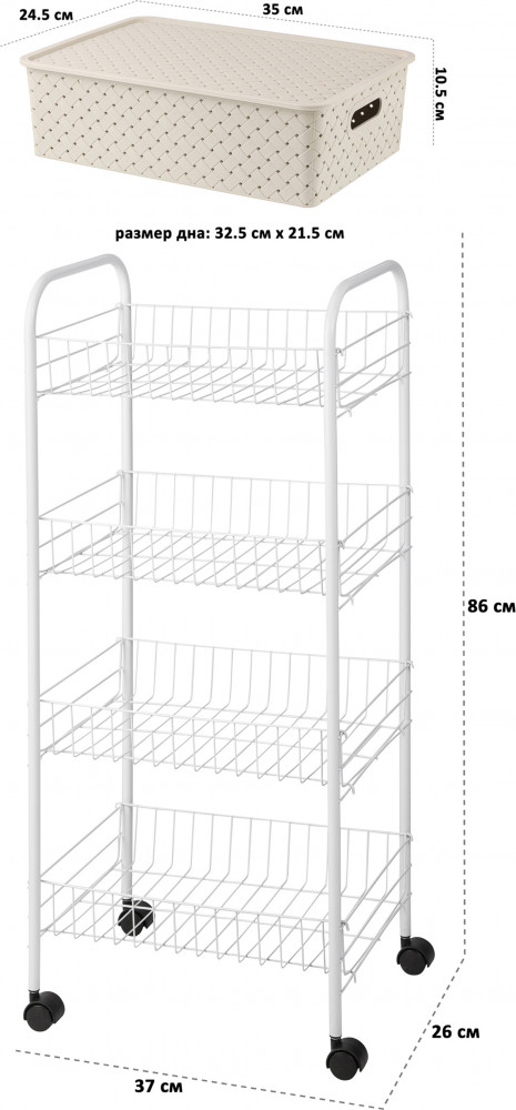 Удобный размер, легко собирается, можно корзины пластиковые использовать отдельно (на фото только одна корзинка, так их в комплекте 4 и крышки 2)