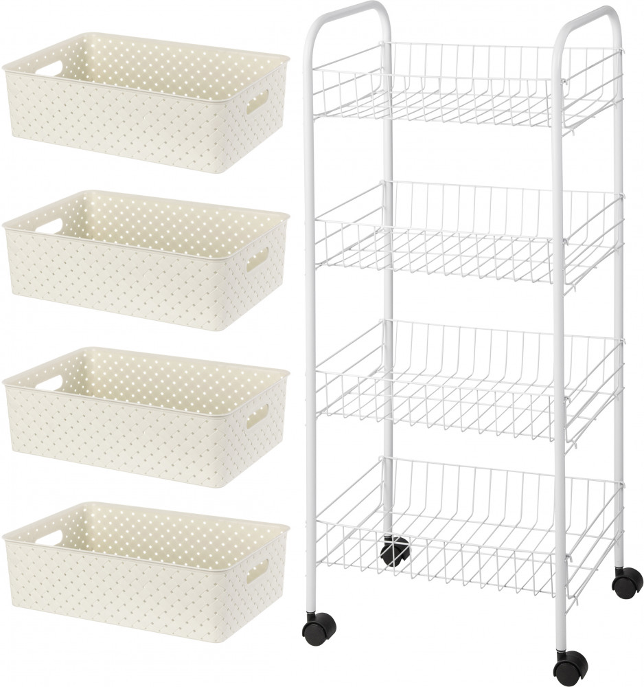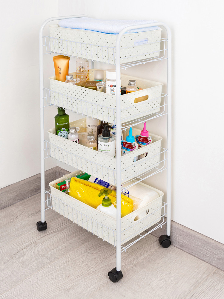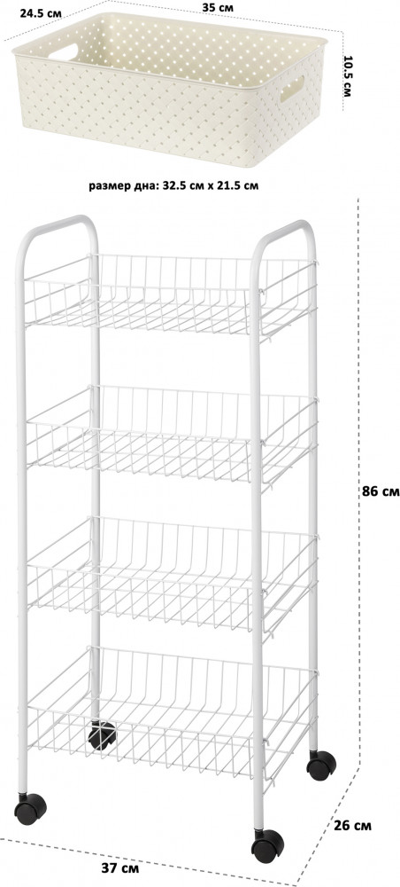 Хорошая этажерка. Не дочитала инструкцию по сборке до конца, не сразу поняла как же закрепить проволочные корзины чтобы вся конструкция не распалась. Зато потом этажерка оказалась очень удобной. Единственный минус - колёсики просто вставляются в боковые стойки и всё. То есть этажерку можно только передвигать, приподнять нельзя - сразу колёсики выпадают. Но в целом очень удобная и вместительная.