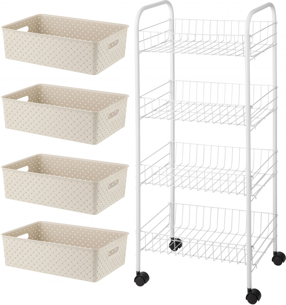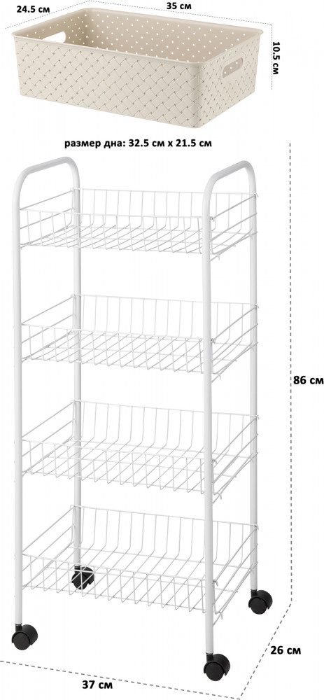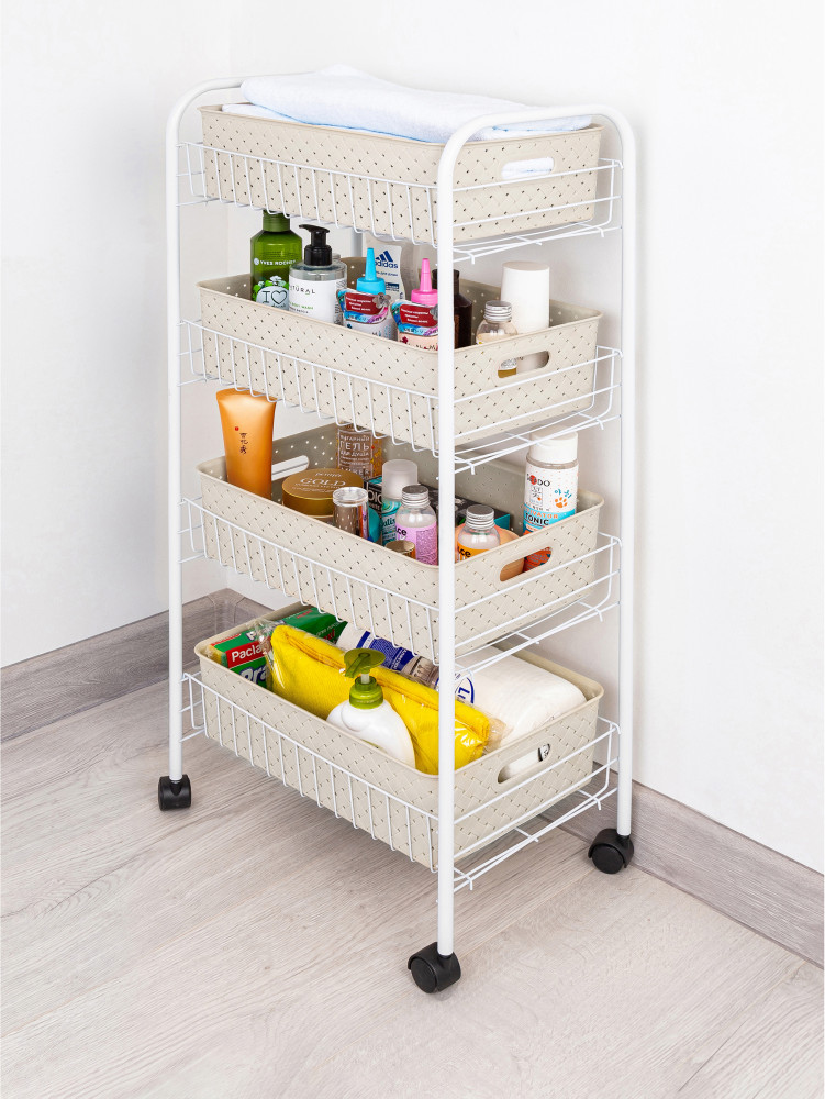 Хорошая этажерка. Не дочитала инструкцию по сборке до конца, не сразу поняла как же закрепить проволочные корзины чтобы вся конструкция не распалась. Зато потом этажерка оказалась очень удобной. Единственный минус - колёсики просто вставляются в боковые стойки и всё. То есть этажерку можно только передвигать, приподнять нельзя - сразу колёсики выпадают. Но в целом очень удобная и вместительная.