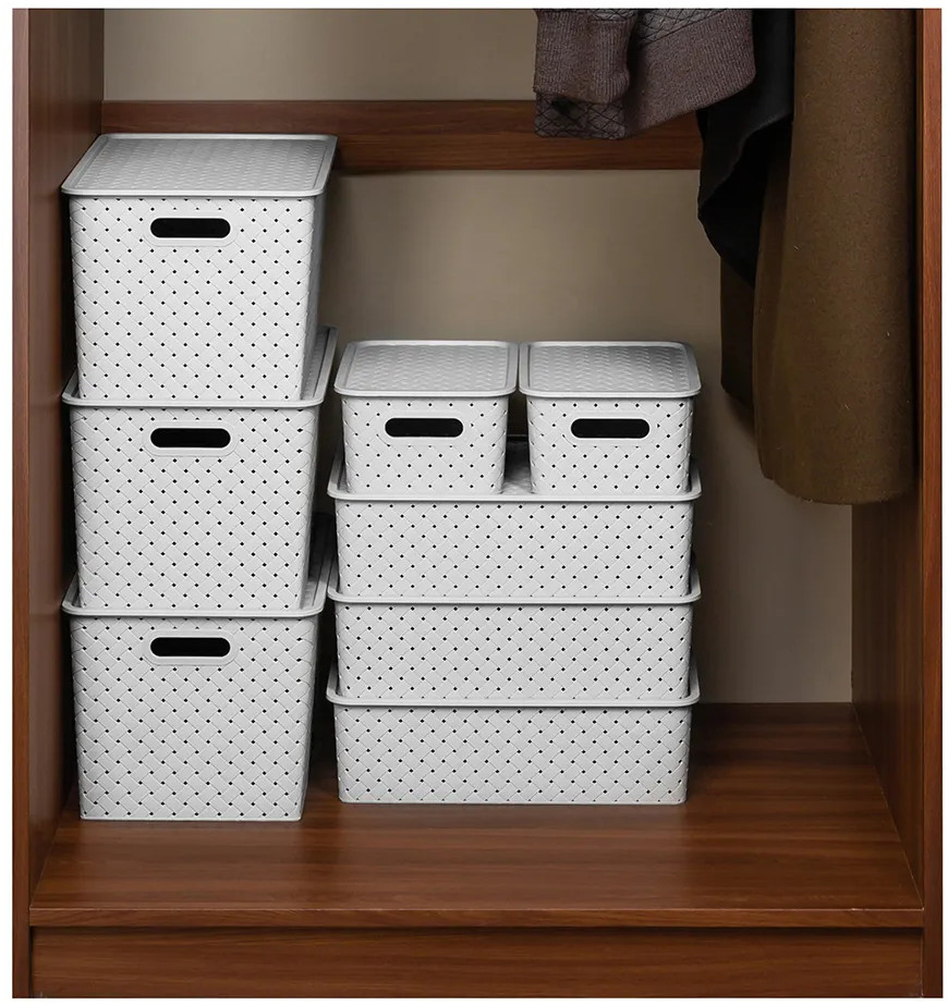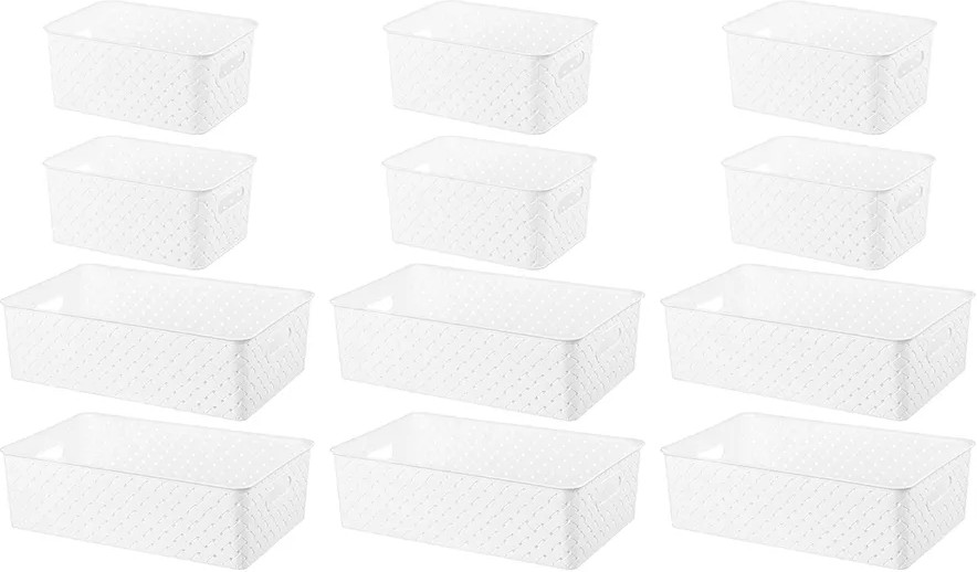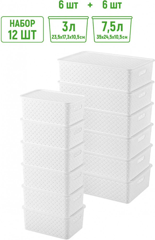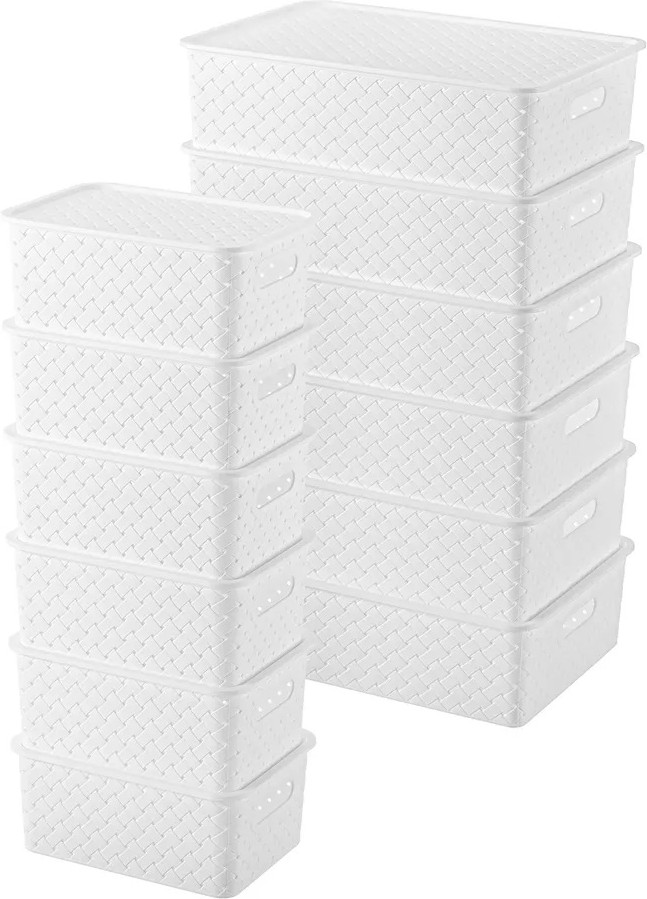 Набор из 12-ти корзин с ручками и крышками можно разместить на кухне, в ванной, прихожей, офисе, гараже или в шкафу. Большие коробки подойдут для бытовой химии, игрушек, одежды (для шапок, перчаток, белья, носков), а маленькие корзинки — для канцелярии, косметики, украшений, рукоделия (для пряжи, вязания) и других мелочей. Контейнеры 7,5 литра подойдут для документов и бумаги А4.
