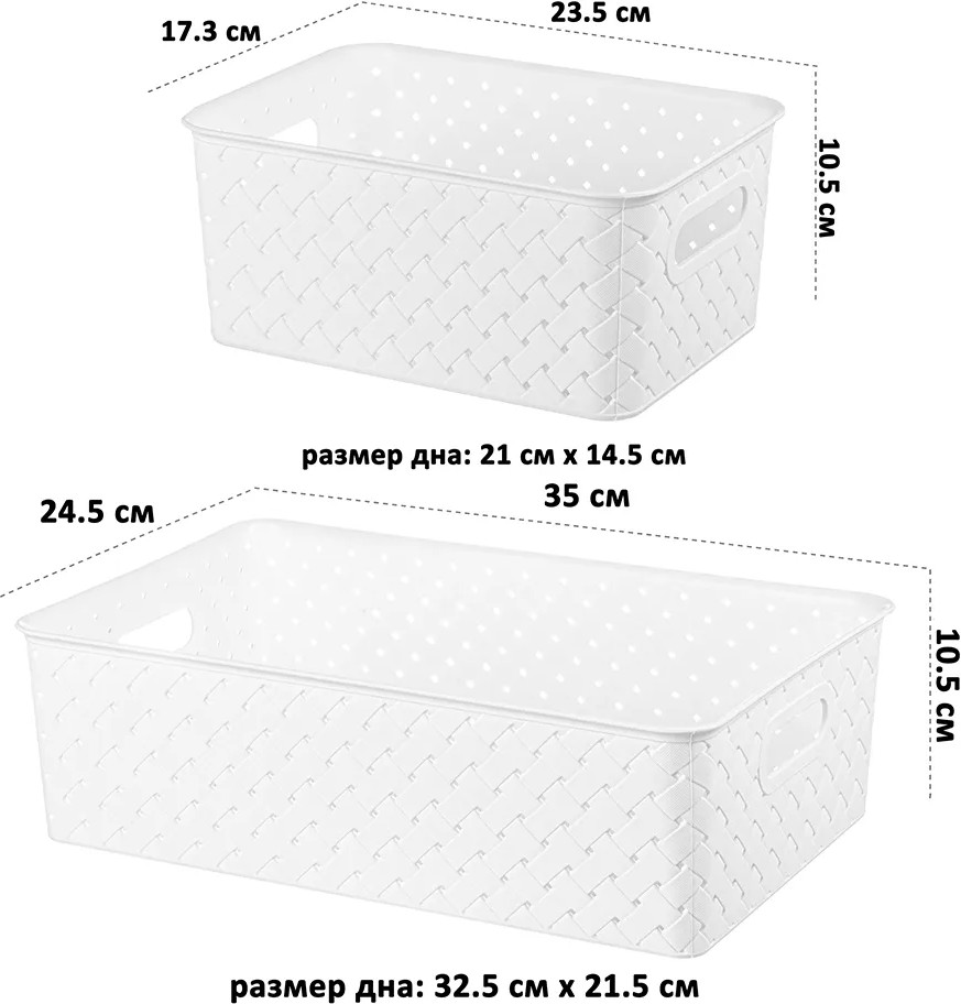Корзины выполнены из пищевого полипропилена и украшены декоративными рельефными узорами с отверстиями для вентиляции. Полностью безопасны и подходят для продуктов. Используйте их для овощей, как хлебницы или фруктовые корзинки. Можно использовать как подарочные боксы: собрать наборы для мужчин и женщин, девушек и парней, мальчиков и девочек. Пластиковые корзины из серии «Береста» привлекательно выглядят и помогут создать систему для хранения вещей в едином стиле или гардеробную систему в вашей прихожей!