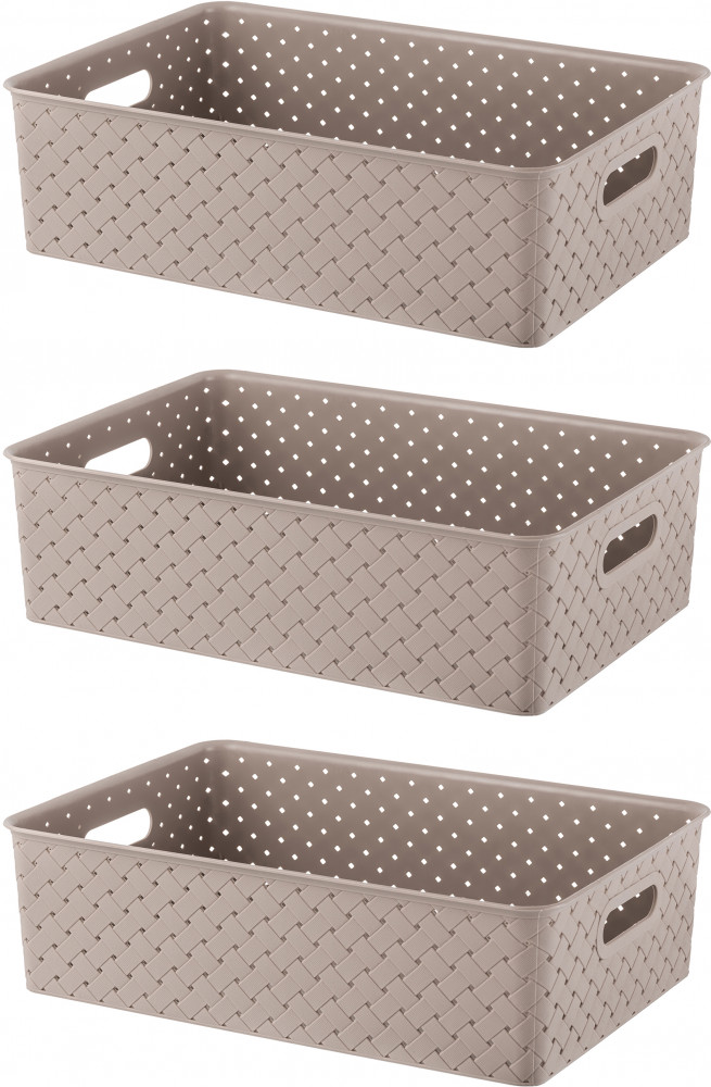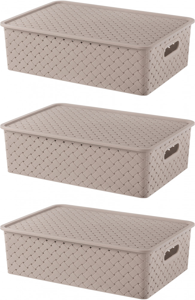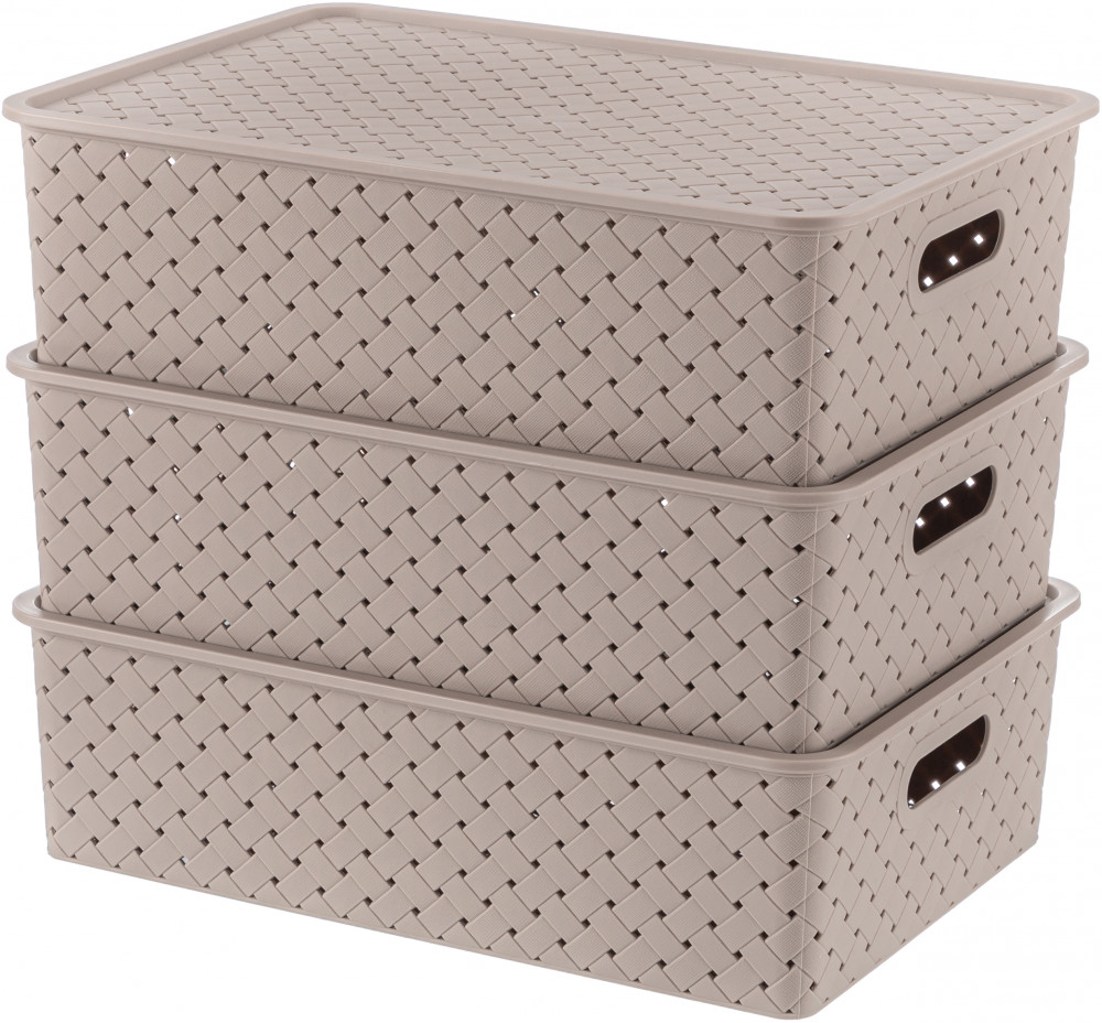 Набор из 3-х корзин по 7,5 литра с ручками и крышками можно разместить на кухне, в ванной, прихожей, офисе, гараже или в шкафу. Пластиковые корзины подойдут для бытовой химии, игрушек, одежды (для шапок, перчаток, белья, носков), канцелярии, косметики, украшений, рукоделия (для пряжи, вязания) и других мелочей. Контейнеры 7,5 литра подойдут для документов и бумаги А4. Корзины выполнены из пищевого полипропилена и украшены декоративными рельефными узорами с отверстиями для вентиляции. Полностью безопасны и подходят для продуктов. Используйте их для овощей, как хлебницы или фруктовые корзинки. Можно использовать как подарочные боксы: собрать наборы для мужчин и женщин, девушек и парней, мальчиков и девочек. Большие коробки и маленькие корзинки из серии «Береста» привлекательно выглядят и помогут создать систему для хранения вещей в едином стиле или гардеробную систему в вашей прихожей!
