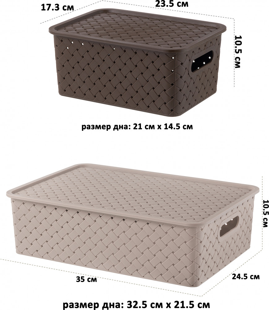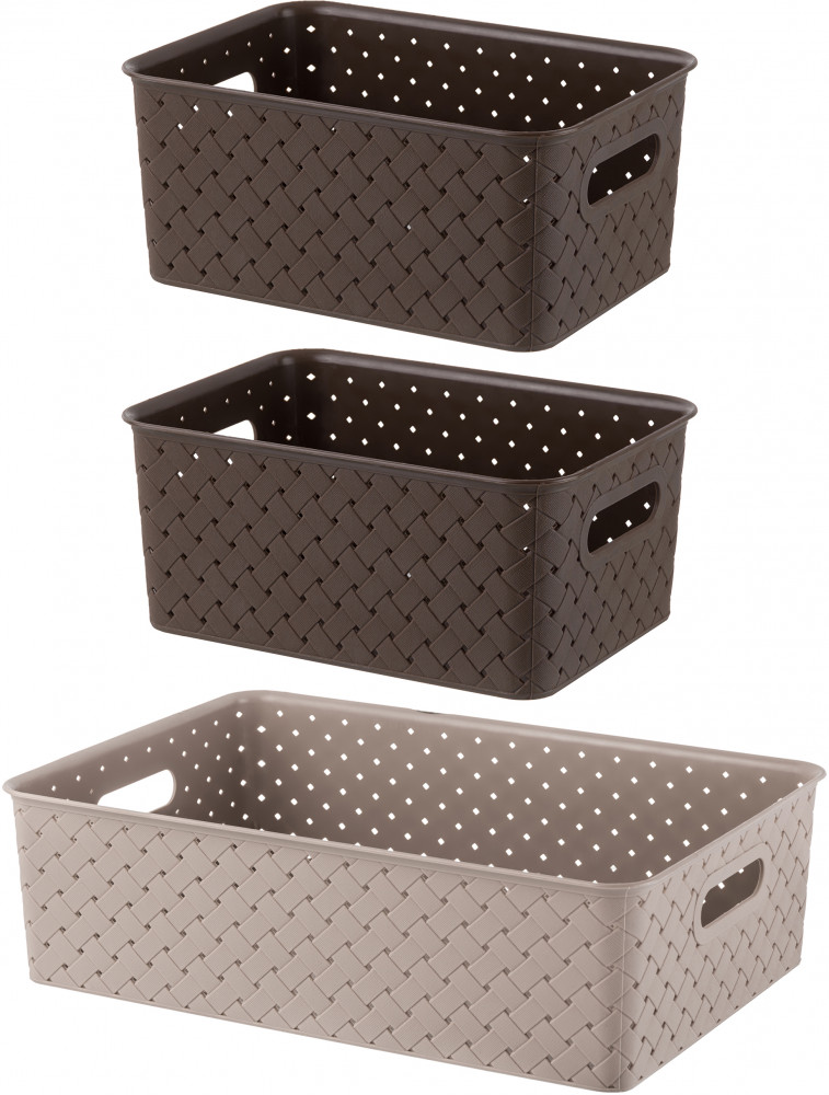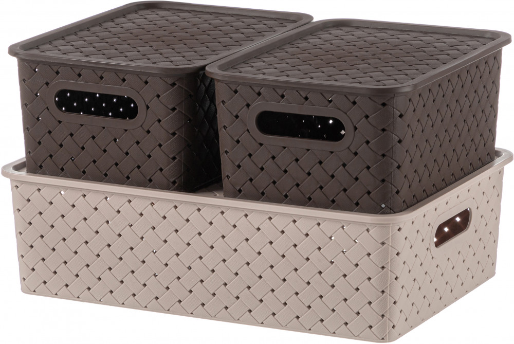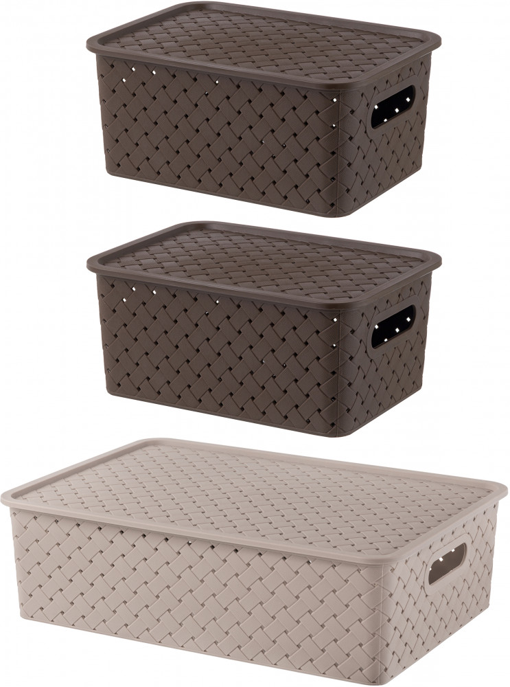 Набор из 3-х корзин с ручками и крышками (7,5 литра, 3 литра) можно разместить на кухне, в ванной, прихожей, офисе, гараже или в шкафу. Большие коробки подойдут для бытовой химии, игрушек, одежды (для шапок, перчаток, белья, носков), а маленькие корзинки — для канцелярии, косметики, украшений, рукоделия (для пряжи, вязания) и других мелочей. Контейнеры 7,5 литра подойдут для документов и бумаги А4. Корзины выполнены из пищевого полипропилена и украшены декоративными рельефными узорами с отверстиями для вентиляции. Полностью безопасны и подходят для продуктов. Используйте их для овощей, как хлебницы или как фруктовые корзинки. Можно использовать как подарочные боксы: собрать наборы для мужчин и женщин, девушек и парней, мальчиков и девочек. Пластиковые корзины из серии «Береста» привлекательно выглядят и помогут создать систему для хранения вещей в едином стиле или гардеробную систему в вашей прихожей!