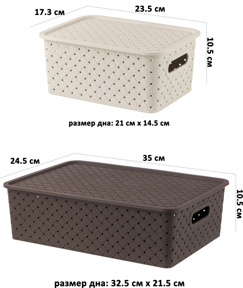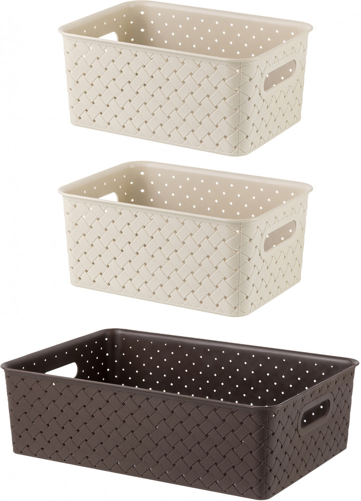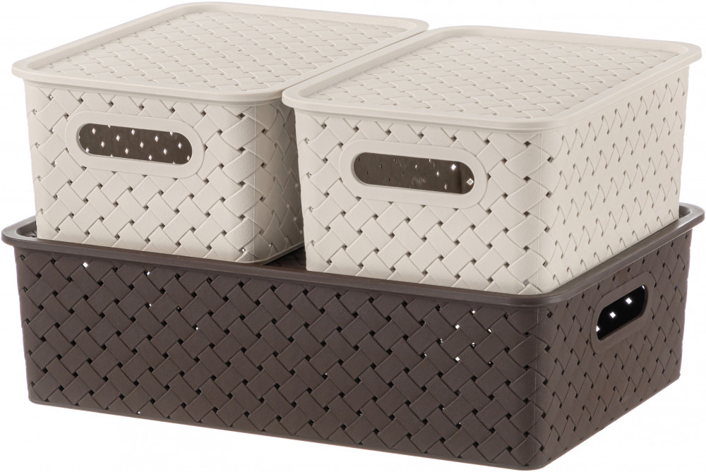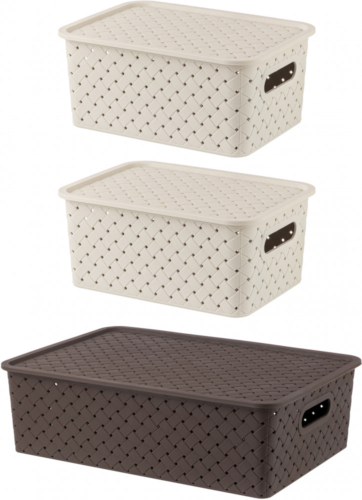 Набор из 3-х корзин с ручками и крышками (7,5 литра, 3 литра) можно разместить на кухне, в ванной, прихожей, офисе, гараже или в шкафу. Большие коробки подойдут для бытовой химии, игрушек, одежды (для шапок, перчаток, белья, носков), а маленькие корзинки — для канцелярии, косметики, украшений, рукоделия (для пряжи, вязания) и других мелочей. Контейнеры 7,5 литра подойдут для документов и бумаги А4. Корзины выполнены из пищевого полипропилена и украшены декоративными рельефными узорами с отверстиями для вентиляции. Полностью безопасны и подходят для продуктов. Используйте их для овощей, как хлебницы или как фруктовые корзинки. Можно использовать как подарочные боксы: собрать наборы для мужчин и женщин, девушек и парней, мальчиков и девочек. Пластиковые корзины из серии «Береста» привлекательно выглядят и помогут создать систему для хранения вещей в едином стиле или гардеробную систему в вашей прихожей!