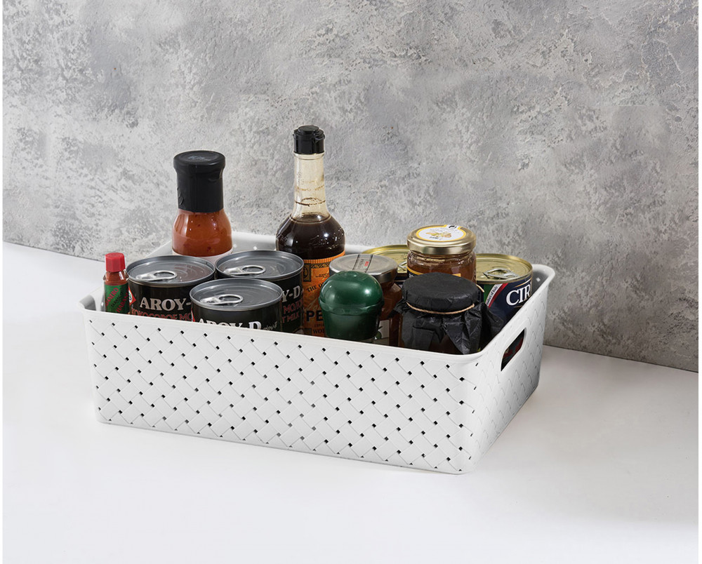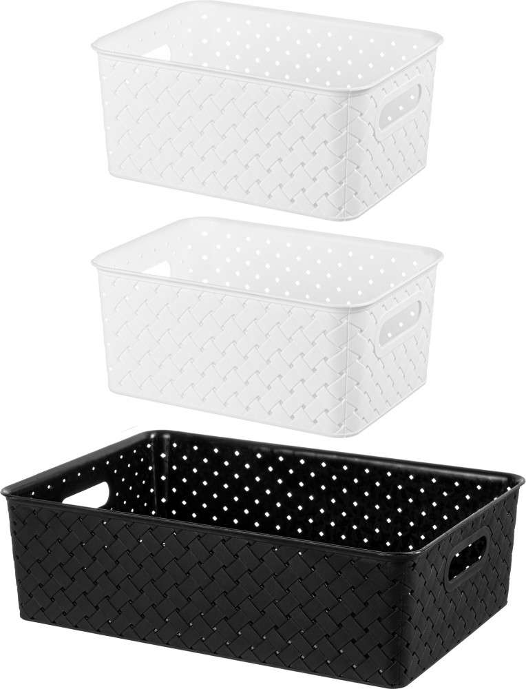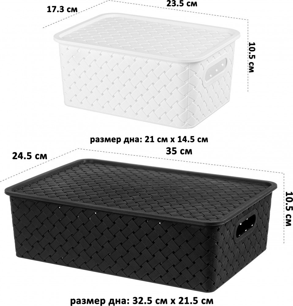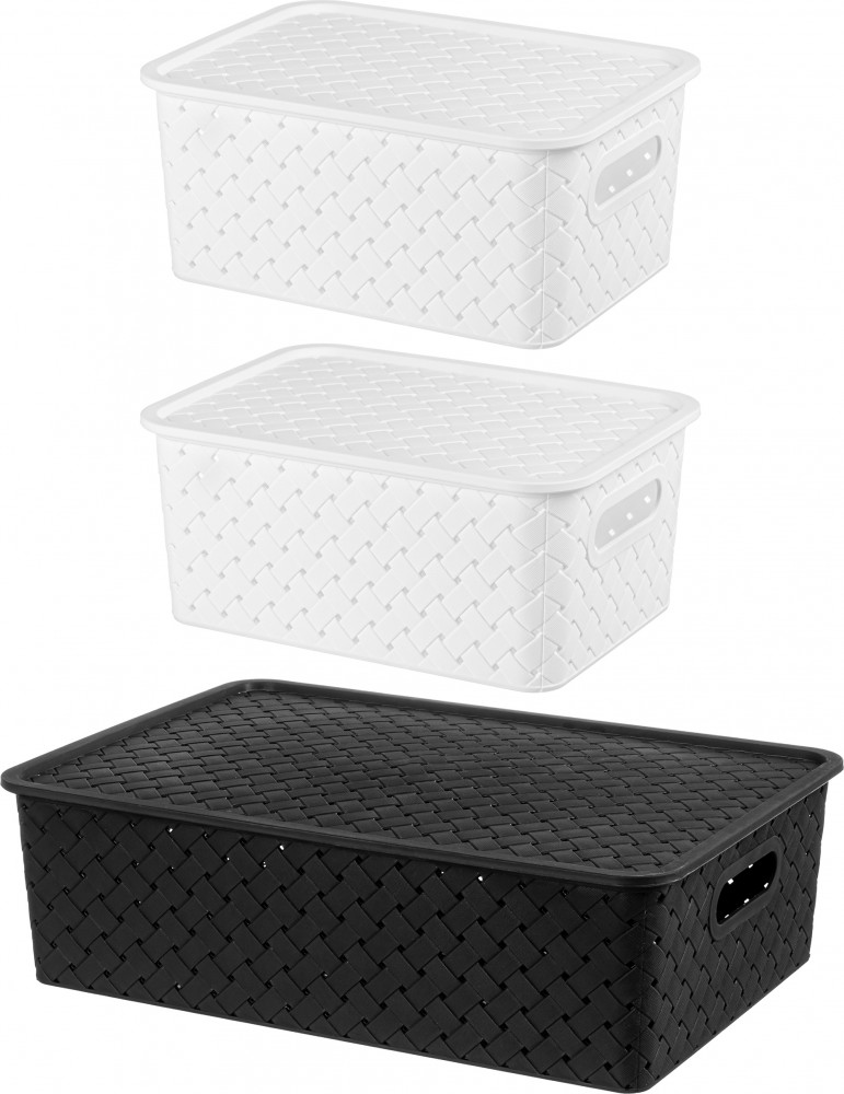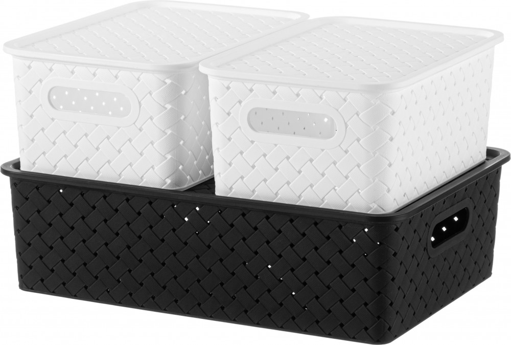 Набор из 3-х корзин с ручками и крышками (7,5 литра, 3 литра) можно разместить на кухне, в ванной, прихожей, офисе, гараже или в шкафу. Большие коробки подойдут для бытовой химии, игрушек, одежды (для шапок, перчаток, белья, носков), а маленькие корзинки — для канцелярии, косметики, украшений, рукоделия (для пряжи, вязания) и других мелочей. Контейнеры 7,5 литра подойдут для документов и бумаги А4. Корзины выполнены из пищевого полипропилена и украшены декоративными рельефными узорами с отверстиями для вентиляции. Полностью безопасны и подходят для продуктов. Используйте их для овощей, как хлебницы или как фруктовые корзинки. Можно использовать как подарочные боксы: собрать наборы для мужчин и женщин, девушек и парней, мальчиков и девочек. Пластиковые корзины из серии «Береста» привлекательно выглядят и помогут создать систему для хранения вещей в едином стиле или гардеробную систему в вашей прихожей!