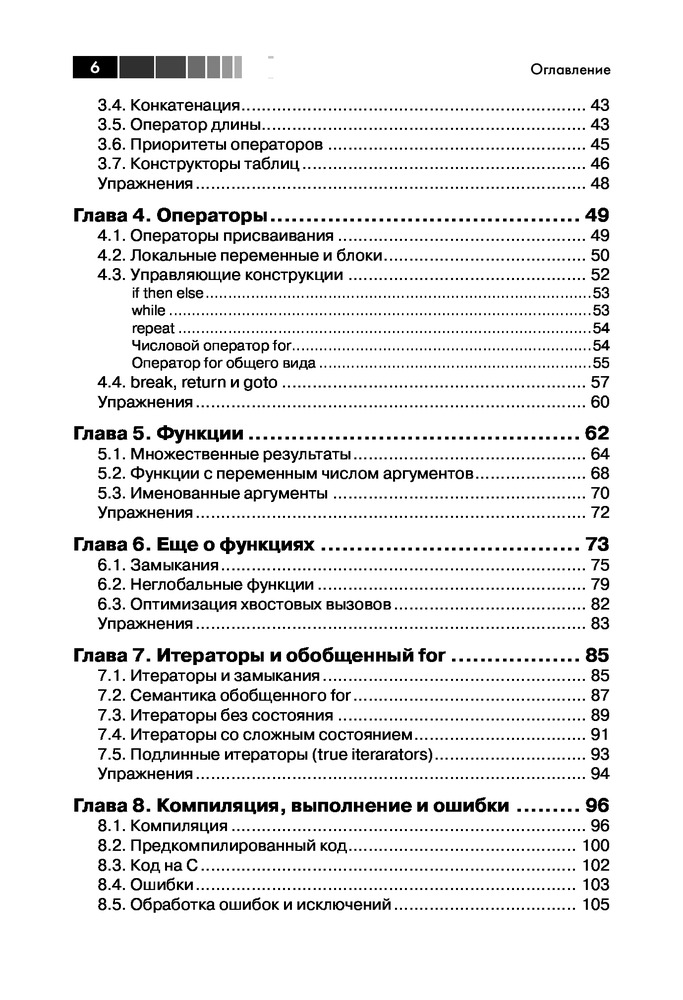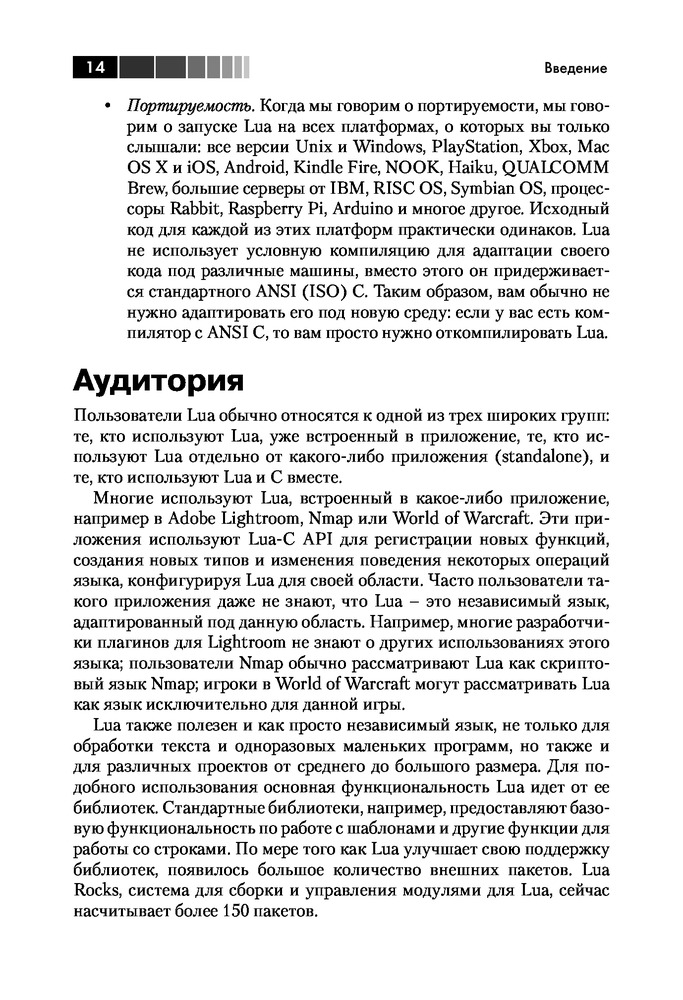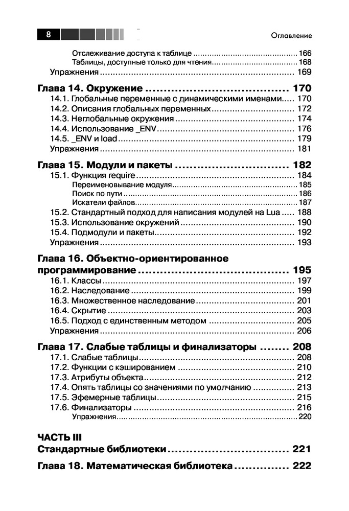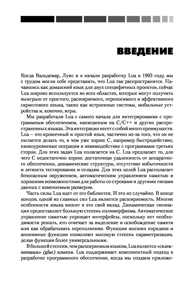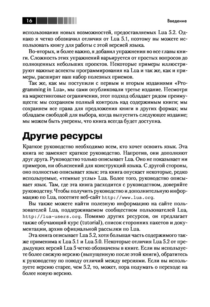 Книга посвящена одному из самых популярных встраиваемых языков — Lua. Этот язык использовался во многих играх и большом количестве различных приложений. Язык сочетает небольшой объем занимаемый памяти, высокое быстродействие, простоту использования и большую гибкость. Книга рассматривает практически все аспекты использования Lua, начиная с основ языка и заканчивая тонкостями расширения языка и взаимодействия с С. |