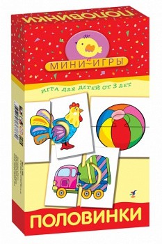 В наборе 12 карточек размером 8х7,5см, каждая из которых делится пополам. На карточках изображены мухомор, мяч, медвежонок, петух, кошка, уточка, машина, кораблик, домик, барабан, лошадка и елка. Картон плотный. Ребенок (1,5 года) справляется.