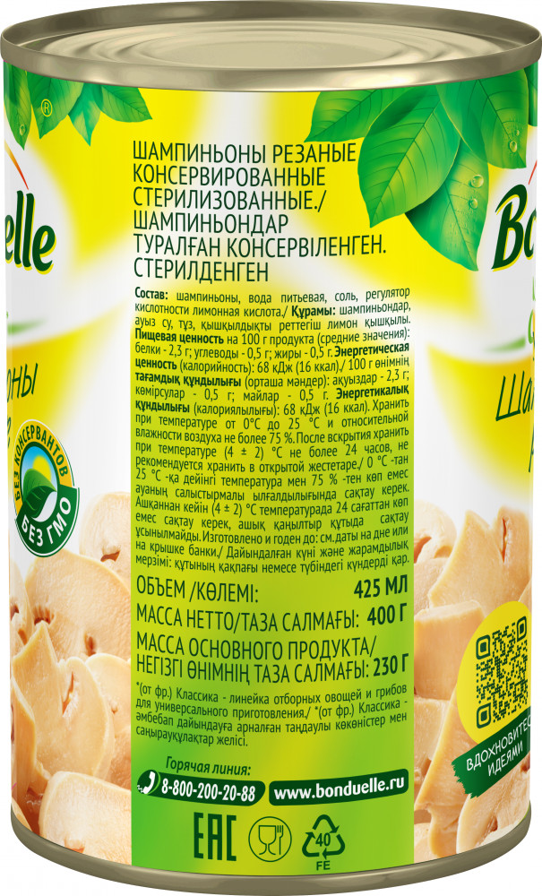 Bonduelle Шампиньоны «Резаные»В данный момент этот товар отсутствует в продаже. Возможно, у нас найдется аналогичный или похожий товар здесь. Неизменно качественные, отборные молодые шампиньоны собраны на ранней стадии созревания. Вкуснейшие грибы одного цвета и размера аккуратно очищены и нарезаны, чтобы сэкономить ваше время на приготовлении блюда и продлить удовольствие от наслаждения им. |
