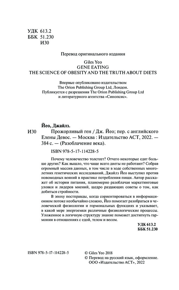 💳 Оплатить за товар можно при получении 🇰🇿 Есть бесплатная доставка по Казахстану от 1 дня 🎁 Копите бонусы с каждой покупки Серия: Разоблачения века Почему человечество толстеет? Отчего некоторые едят больше других? Как вышло, что чаще всего диеты не работают? Собрав огромный массив данных, в том числе в ходе собственных многолетних генетических исследований, Джайлз Йео выступил против новомодных веяний в практике потребления пищи. Автор расскажет об истории питания, планомерно разоблачая маркетинговые уловки и лидеров мнений, щедро раздающих советы о том, как добиться стройности. |