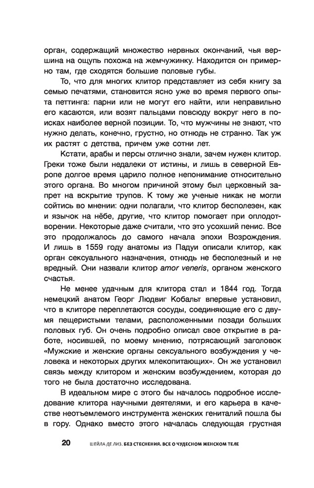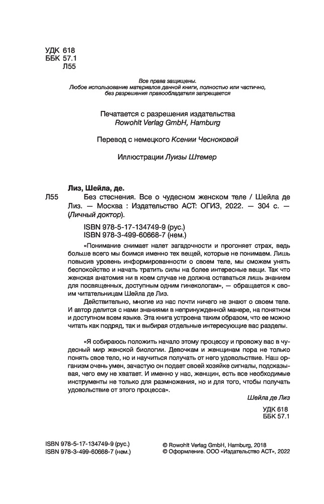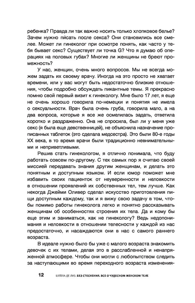 Серия: Личный доктор «Понимание снимает налет загадочности и прогоняет страх, ведь больше всего мы боимся именно тех вещей, которые не понимаем. Лишь повысив уровень информированности о своем теле, мы сможем унять беспокойство и начать тратить силы на более интересные вещи. Так что женская анатомия ни в коем случае не должна оставаться лишь знанием для посвященных, доступным одним гинекологам», — обращается к своим читательницам Шейла де Лиз.