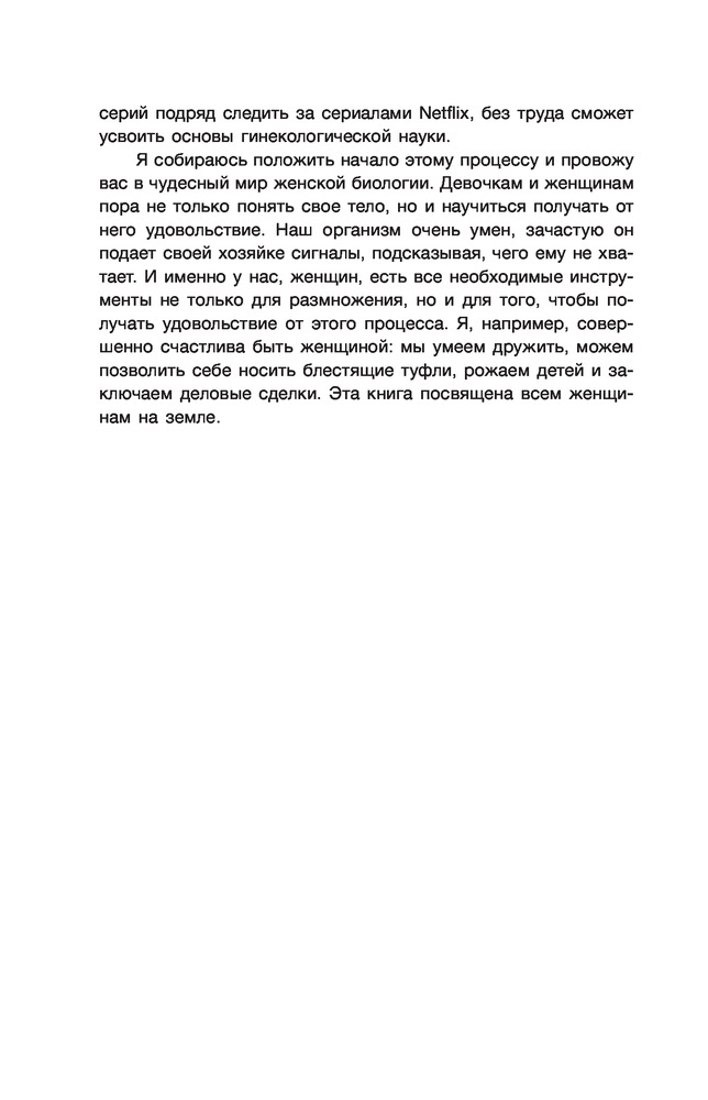 «Я собираюсь положить начало этому процессу и провожу вас в чудесный мир женской биологии. Девочкам и женщинам пора не только понять свое тело, но и научиться получать от него удовольствие. Наш организм очень умен, зачастую он подает своей хозяйке сигналы, подсказывая, чего ему не хватает. И именно у нас, женщин, есть все необходимые инструменты не только для размножения, но и для того, чтобы получать удовольствие от этого процесса», — Шейла де Лиз.