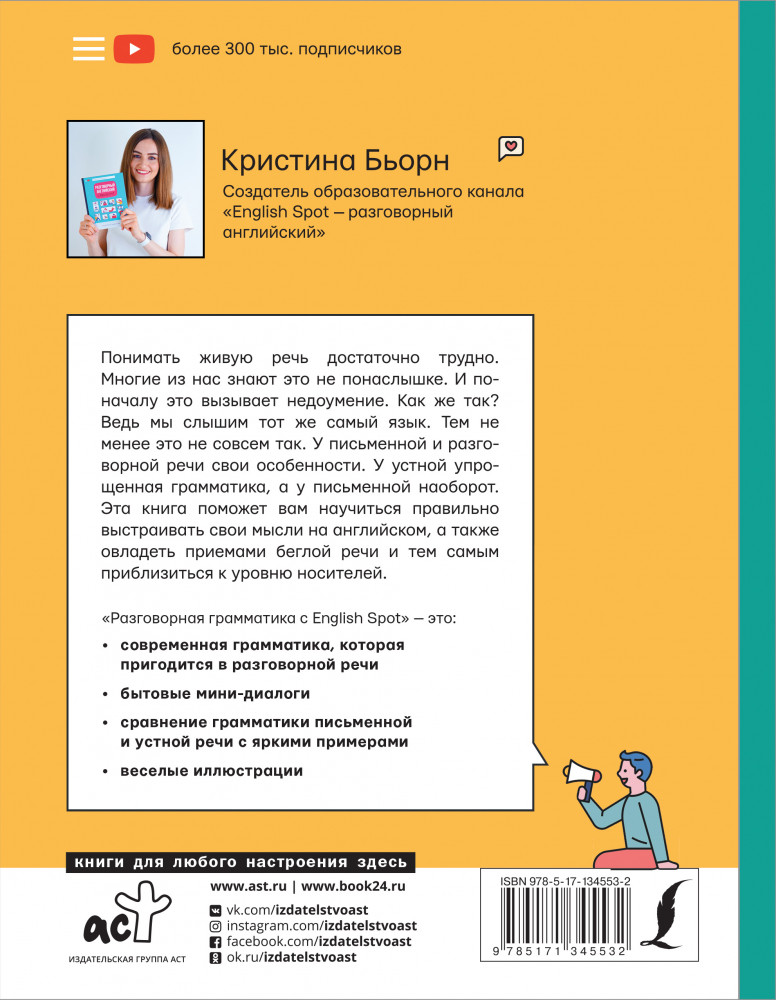 Разговорная грамматика с English SpotВ данный момент этот товар отсутствует в продаже. Возможно, у нас найдется аналогичный или похожий товар здесь. Серия: Звезда YouTube «Разговорная грамматика с English Spot» расскажет вам об особенностях грамматики устной речи, а также поможет научиться правильно выстраивать свои мысли на английском и тем самым приблизиться к уровню носителей. Рекомендуется использовать данное издание в качестве дополнения к основной программе обучения и применять полученные знания по назначению — для живого общения на английском вне стен учебных заведений. |