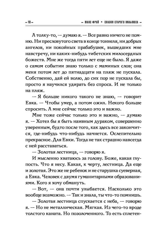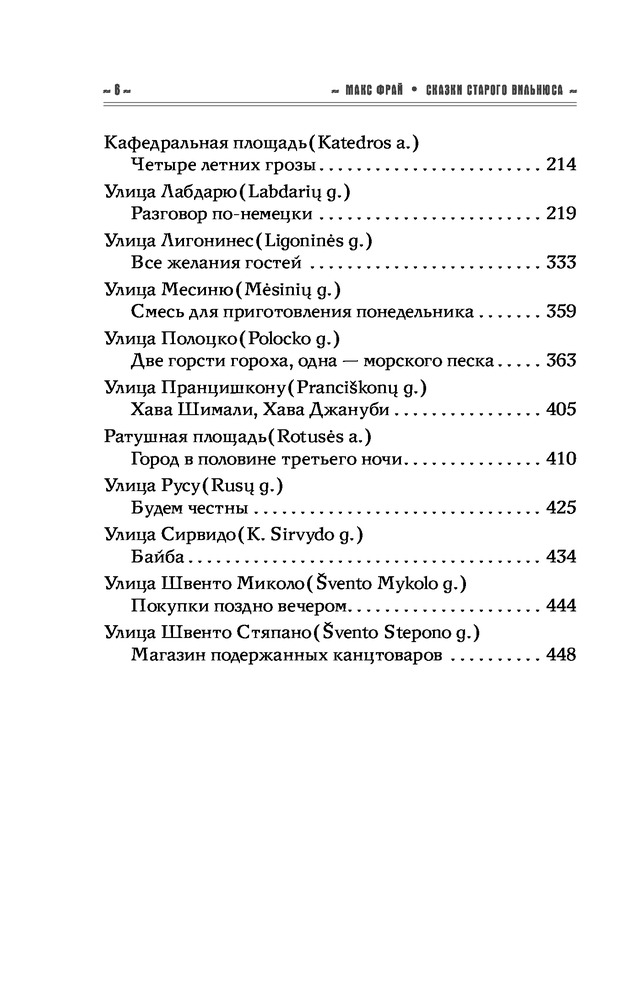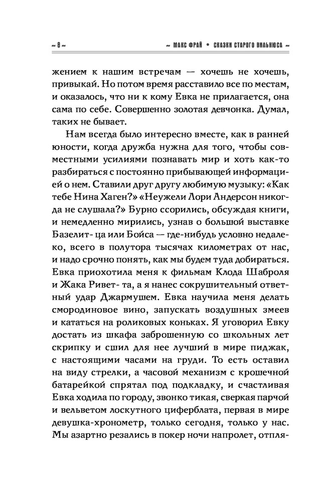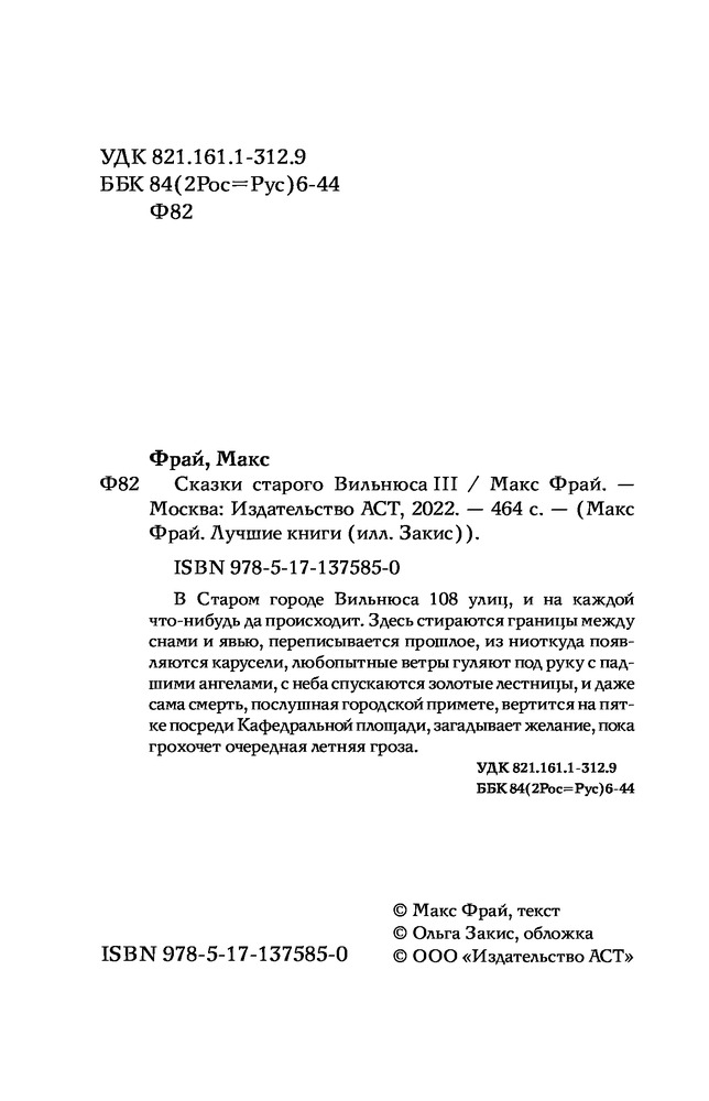 Серия: Макс Фрай. Лучшие книги (илл. Закис) «Сказки старого Вильнюса» — это калейдоскоп волнующих и странных историй, легенд и загадок, главный герой которых — город. В Вильнюсе Макса Фрая пьют кофе, рисуют мелками, играют в нарды, мечтают, выдумывают птиц из бумажных пакетов — словом, делают все то, что многие давно и сильно любят его книги. В Старом городе Вильнюса 108 улиц, и на каждой что-нибудь да происходит. Здесь стираются границы между снами и явью, переписывается прошлое, из ниоткуда появляются карусели, любопытные ветры гуляют под руку с падшими ангелами, с неба спускаются золотые лестницы, и даже сама смерть, послушная городской примете, вертится на пятке посреди Кафедральной площади, загадывает желание, пока грохочет очередная летняя гроза. |