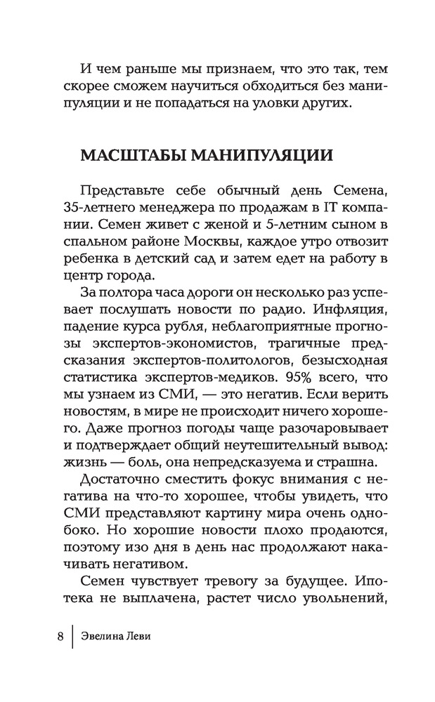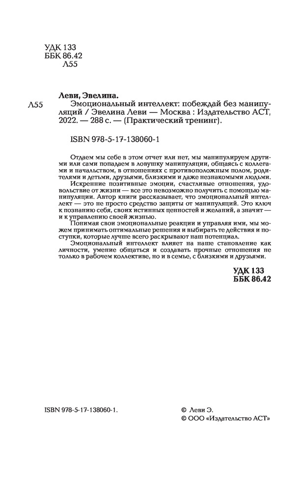 Эмоциональный интеллект. Побеждай без манипуляцийВ данный момент этот товар отсутствует в продаже. Возможно, у нас найдется аналогичный или похожий товар здесь. Серия: Практический тренинг Отдаем мы себе в этом отчет или нет, мы манипулируем другими или сами попадаем в ловушку манипуляции, общаясь с коллегами и начальством, в отношениях с противоположным полом, родителями и детьми, друзьями, близкими и даже незнакомыми людьми. Искренние позитивные эмоции, счастливые отношения, удовольствие от жизни — все это невозможно получить с помощью манипуляции. Автор книги рассказывает, что эмоциональный интеллект — это не просто средство защиты от манипуляций. Это ключ к познанию себя, своих истинных ценностей и желаний, а значит — и к управлению своей жизнью. Понимая свои эмоциональные реакции и управляя ими, мы можем принимать оптимальные решения и выбирать те действия и поступки, которые лучше всего раскрывают наш потенциал. Эмоциональный интеллект влияет на наше становление как личности, умение общаться и создавать прочные отношения не только в рабочем коллективе, но и в семье, с близкими и друзьями. |
