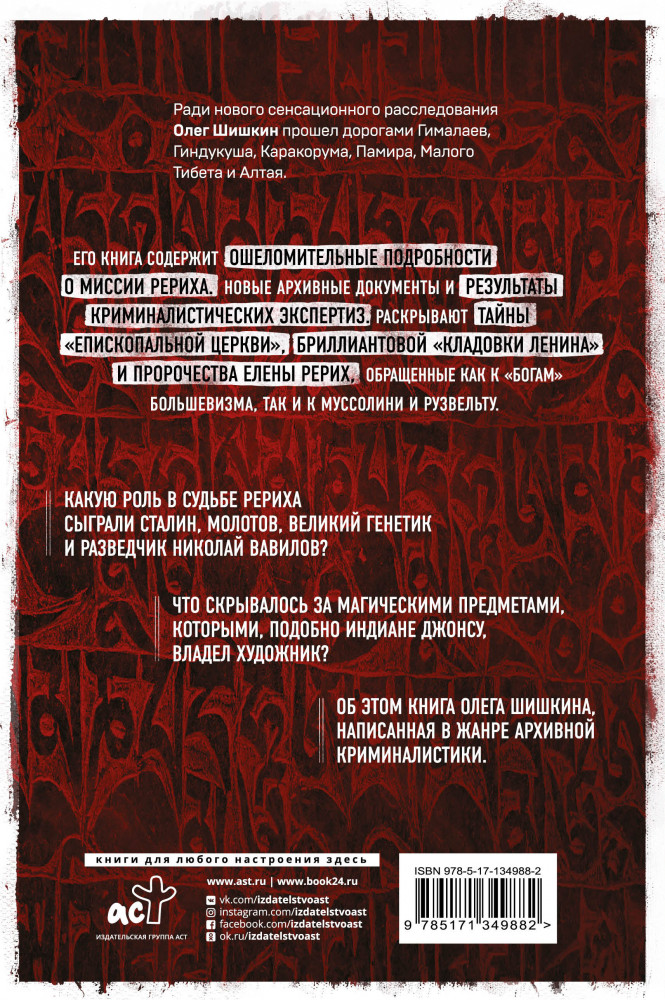 Ради сенсационного исследования о Николае Рерихе он прошел дорогами Гималаев, Гиндукуша, Каракорума, Памира, Малого Тибета и Алтая. Его новая книга написана в жанре архивной криминалистики и содержит ошеломительные подробности, редкие архивные документы и рассекреченные результаты научных экспертиз.