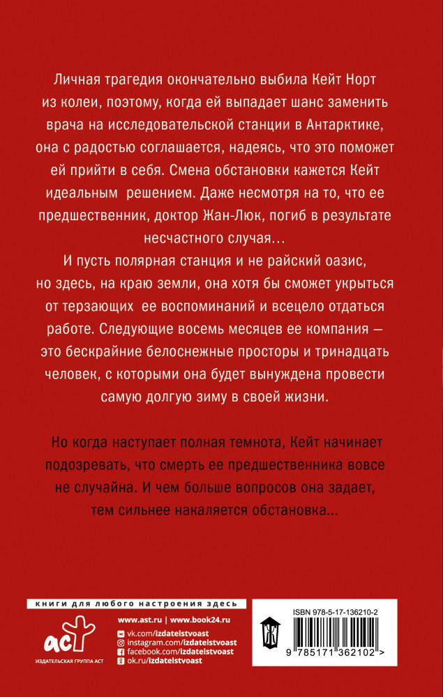 ТьмаВ данный момент этот товар отсутствует в продаже. Возможно, у нас найдется аналогичный или похожий товар здесь. Серия: Объявлено убийство Личная трагедия окончательно выбила Кейт Норт из колеи, поэтому, когда ей выпадает шанс заменить врача на исследовательской станции в Антарктике, она с радостью соглашается, надеясь, что это поможет ей прийти в себя. Смена обстановки кажется Кейт идеальным решением. Даже несмотря на то, что ее предшественник, доктор Жан-Люк, погиб в результате несчастного случая... |
