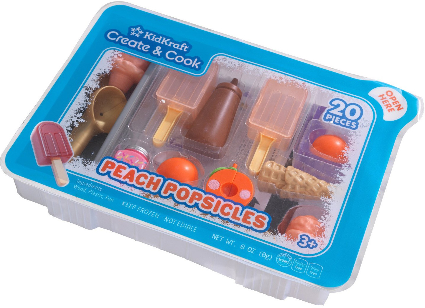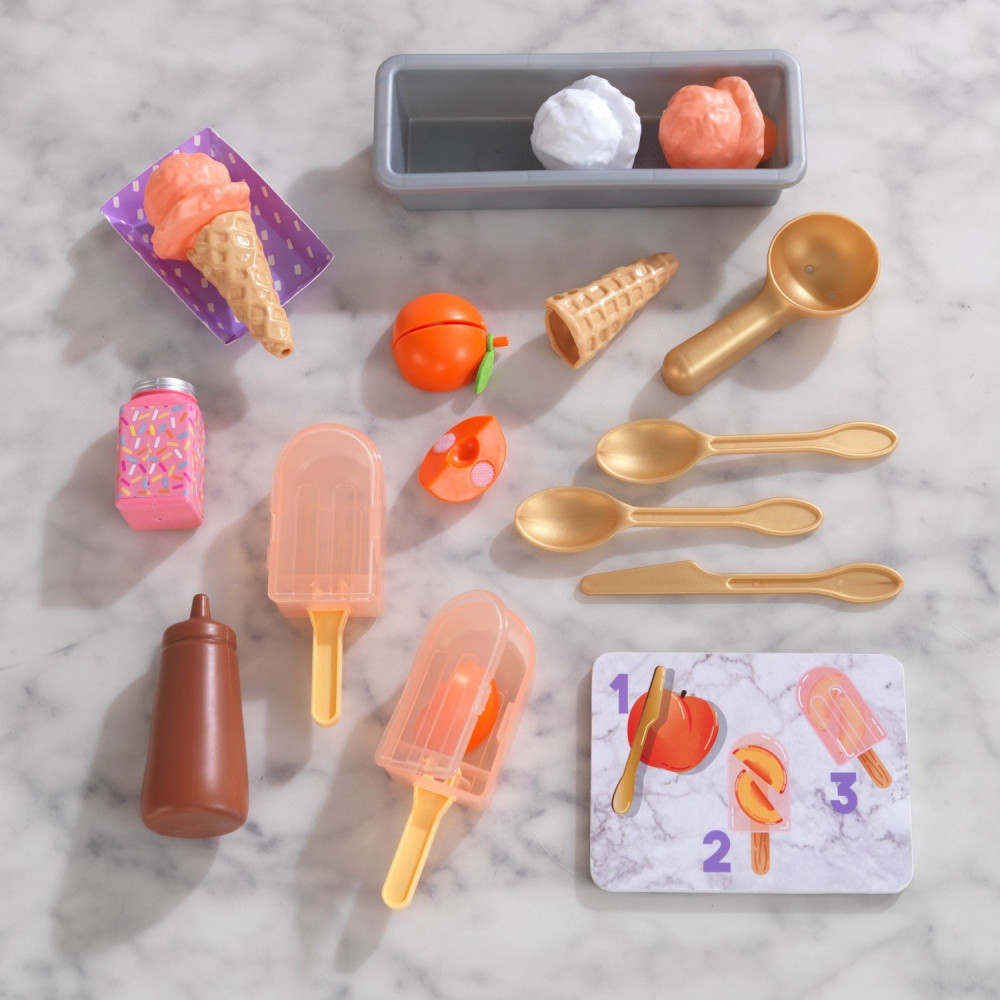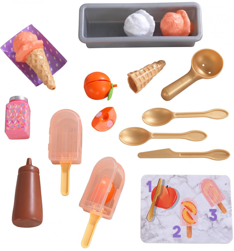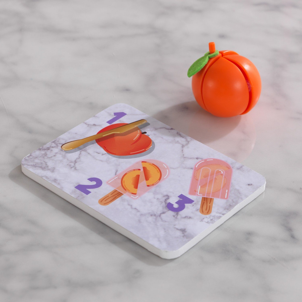 Во время игры ребенок сможет развить моторику рук, пофантазировать, а также представить себя в роли повара или посетителя кондитерской. Все элементы набора изготовлены из качественных и безопасных материалов. Ломтики персика можно поместить внутрь фруктового мороженого для получения ледяного угощения. Ломтики персика соединены магнитами. Его легко можно разрезать по половинкам и добавить в ледяное мороженное. Карточка с рецептами служит также разделочной доской. Для более насыщенного вкуса в набор добавлена посыпка и шоколадный соус.