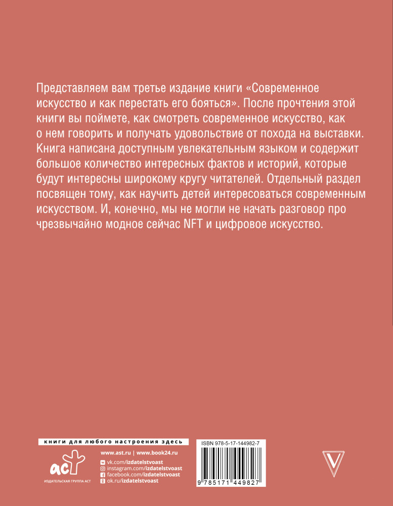 Представляем вам третье издание книги «Современное искусство и как перестать его бояться». После прочтения этой книги вы поймете, как смотреть современное искусство, как о нем говорить и получать удовольствие от похода на выставки. Книга написана доступным увлекательным языком и содержит большое количество интересных фактов и историй, которые будут интересны широкому кругу читателей. Отдельный раздел посвящен тому, как научить детей интересоваться современным искусством и, конечно, мы не могли не начать разговор про чрезвычайно модное сейчас NFT и цифровое искусство. |