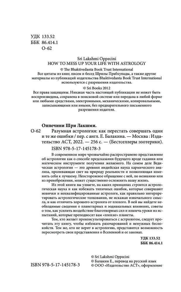 Серия: Бестселлеры эзотерики В современном мире чрезвычайно распространено представление об астрологии как о способе предсказания будущего вроде гадания или магическом инструменте получения желаемого. На самом деле Ведическая астрология — это древняя индийская наука кармического анализа, проливающая свет на природу реальности и позволяющая изменить себя к лучшему. Неосторожное обращение с ней, по незнанию или из пренебрежения, может существенно осложнить вашу жизнь. Из этой книги вы узнаете, на каких принципах строится астрологическая наука и как избежать типичных ошибок, которые совершают новички и неквалифицированные астрологи, как правильно интерпретировать астрологические толкования, не искажая изначального смысла, и как отличить хорошего астролога от плохого. В ней вы найдете необходимые сведения о планетарных и зодиакальных влияниях, советы о том, как усилить воздействие благотворных сил и извлечь уроки из испытаний, которые преподносят вам «плохие» планеты. Тем, кто желает проконсультироваться с астрологом, следует прочитать эту книгу, чтобы избежать разочарований и ненужных беспокойств. Тем же, кто не верит в астрологию, представится возможность пересмотреть свои представления о Вселенной и ее законах. |