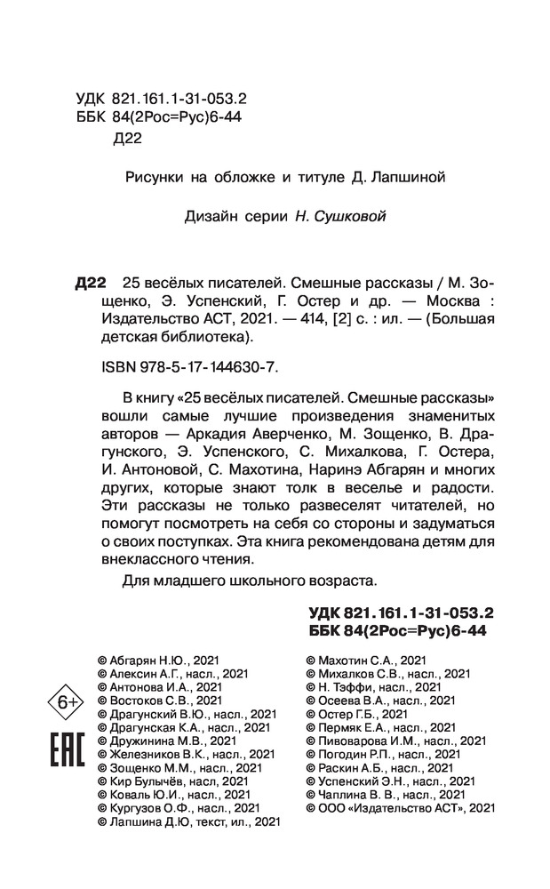 💳 Оплатить за товар можно при получении 🇰🇿 Есть бесплатная доставка по Казахстану 🎁 Копите бонусы с каждой покупки Серия: Большая детская библиотека Любишь веселиться и смеяться? В нашей книге собраны самые смешные рассказы самых весёлых писателей, да не простых, а самых что ни на есть знаменитых! От Михаила Зощенко до Наринэ Абгарян, от Виктора Драгунского до Эдуарда Успенского, от Аркадия Аверченко до Григория Остера и ещё много-много авторов, чьи произведения порадуют всех без исключения. |