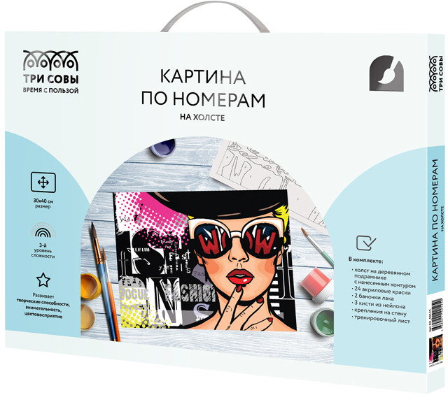 • холст на деревянном подрамнике 30×40 с нанесенным контуром, пронумерованный в соответствии с номерами красок. Контур под раскрашивание нанесен в том числе и на торцы подрамника, что позволяет разместить готовую работу на стене не обрамляя в багет или раму. Технология точной разбивки сюжета картины на разные цветовые оттенки гарантируют правильность исполнения полотна;