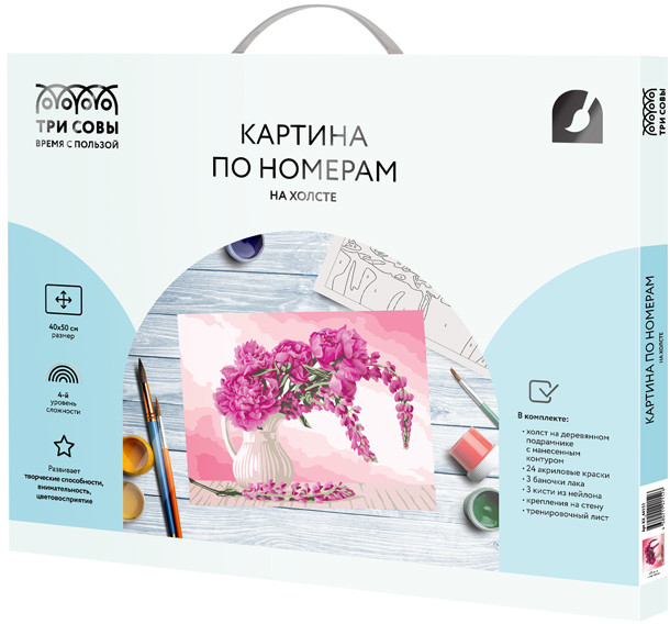 • холст на деревянном подрамнике 40×50 с нанесенным контуром, пронумерованный в соответствии с номерами красок. Контур под раскрашивание нанесен в том числе и на торцы подрамника, что позволяет разместить готовую работу на стене не обрамляя в багет или раму. Технология точной разбивки сюжета картины на разные цветовые оттенки гарантируют правильность исполнения полотна;