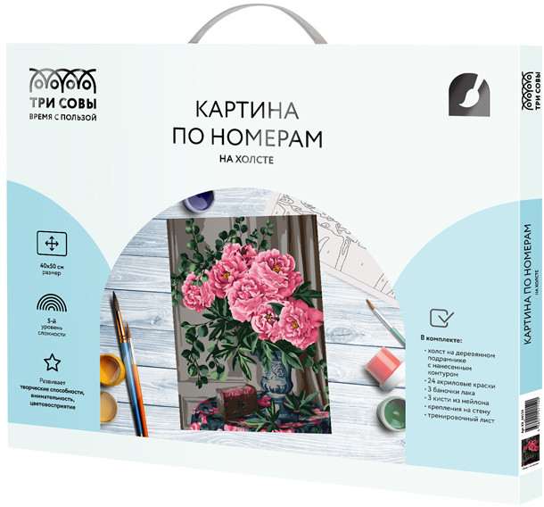 • холст на деревянном подрамнике 40×50 с нанесенным контуром, пронумерованный в соответствии с номерами красок. Контур под раскрашивание нанесен в том числе и на торцы подрамника, что позволяет разместить готовую работу на стене не обрамляя в багет или раму. Технология точной разбивки сюжета картины на разные цветовые оттенки гарантируют правильность исполнения полотна;