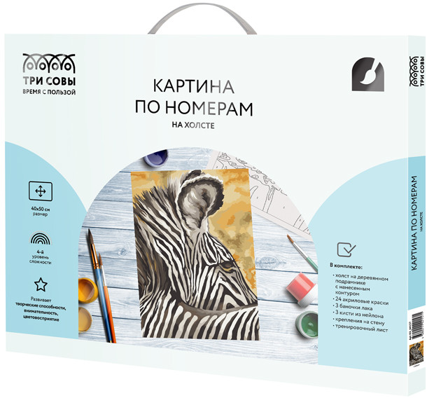 • холст на деревянном подрамнике 40×50 с нанесенным контуром, пронумерованный в соответствии с номерами красок. Контур под раскрашивание нанесен в том числе и на торцы подрамника, что позволяет разместить готовую работу на стене не обрамляя в багет или раму. Технология точной разбивки сюжета картины на разные цветовые оттенки гарантируют правильность исполнения полотна;