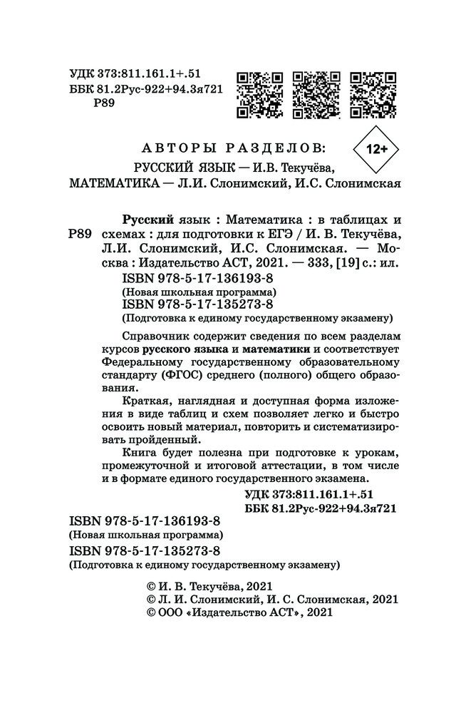 ЕГЭ. Русский язык. Математика в таблицах и схемах для подготовки к ЕГЭИрина Семеновна Слонимская, Лев Иосифович Слонимский, Ирина Викторовна Текучева +42