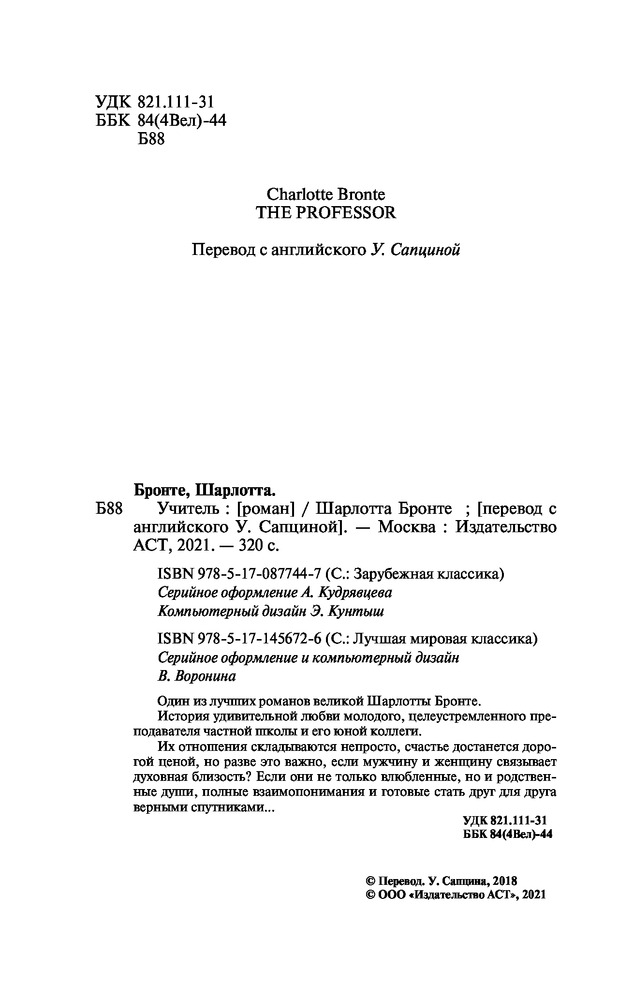 💳 Оплатить за товар можно при получении 🇰🇿 Есть бесплатная доставка по Казахстану от 1 дня 🎁 Копите бонусы с каждой покупки Серия: Лучшая мировая классика Один из лучших романов великой Шарлотты Бронте. История удивительной любви молодого, целеустремленного преподавателя частной школы и его юной коллеги. |