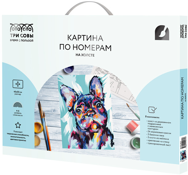 • холст на деревянном подрамнике 40×50 с нанесенным контуром, пронумерованный в соответствии с номерами красок. Контур под раскрашивание нанесен в том числе и на торцы подрамника, что позволяет разместить готовую работу на стене не обрамляя в багет или раму. Технология точной разбивки сюжета картины на разные цветовые оттенки гарантируют правильность исполнения полотна;