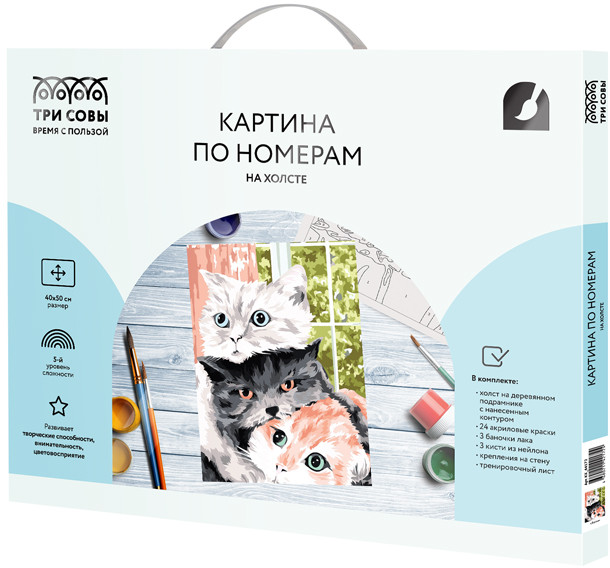 • холст на деревянном подрамнике 40×50 с нанесенным контуром, пронумерованный в соответствии с номерами красок. Контур под раскрашивание нанесен в том числе и на торцы подрамника, что позволяет разместить готовую работу на стене не обрамляя в багет или раму. Технология точной разбивки сюжета картины на разные цветовые оттенки гарантируют правильность исполнения полотна;