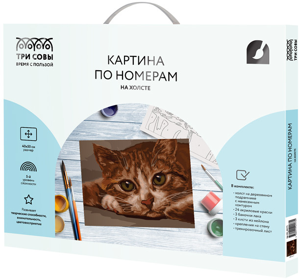 • холст на деревянном подрамнике 40×50 с нанесенным контуром, пронумерованный в соответствии с номерами красок. Контур под раскрашивание нанесен в том числе и на торцы подрамника, что позволяет разместить готовую работу на стене не обрамляя в багет или раму. Технология точной разбивки сюжета картины на разные цветовые оттенки гарантируют правильность исполнения полотна;